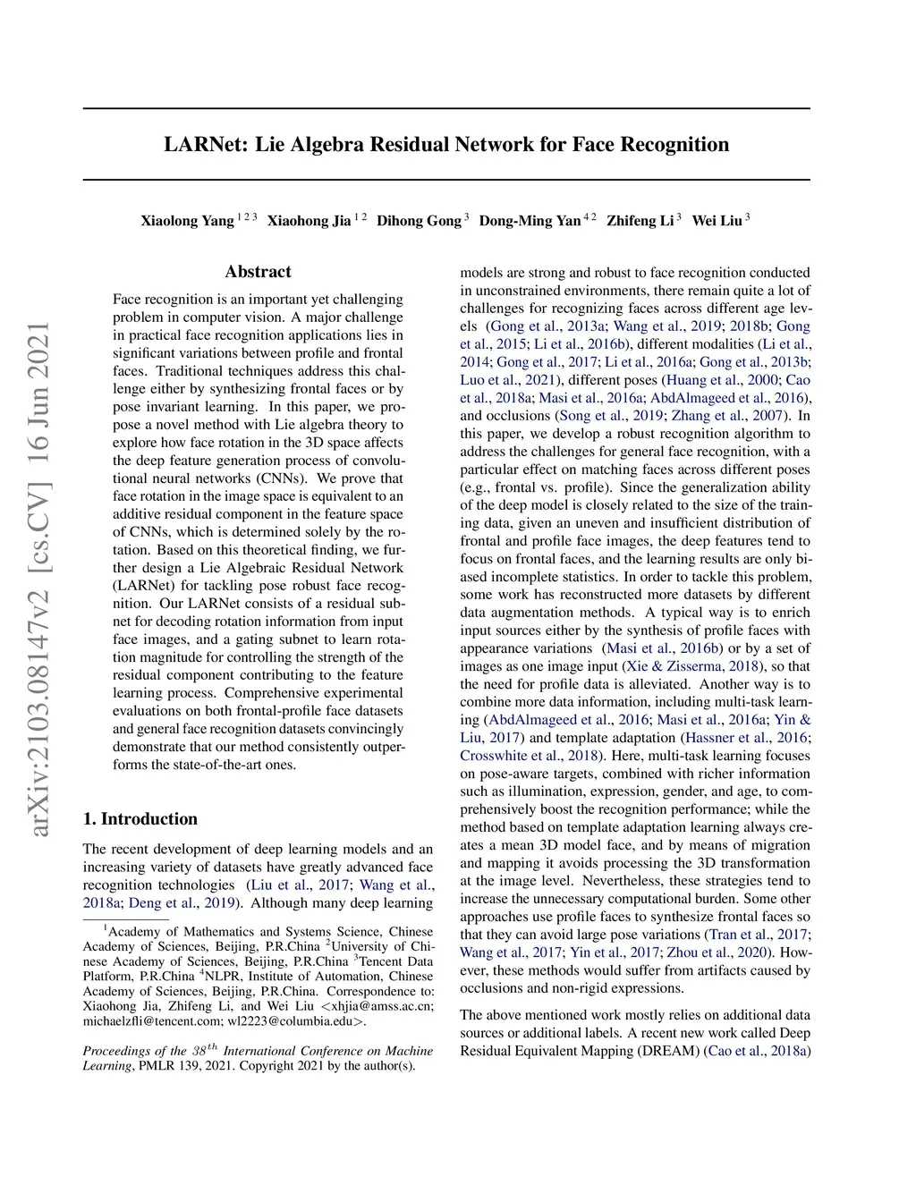 LARNet: Lie Algebra Residual Network for Face Recognition