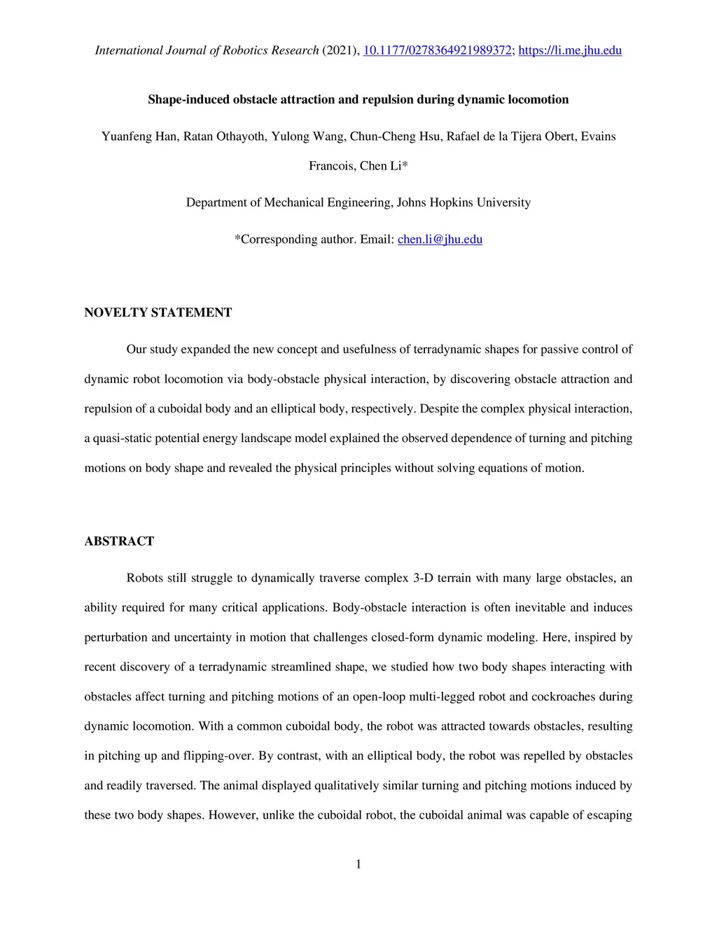 Robots still struggle to dynamically traverse complex 3-D terrain with many large obstacles, an ability required for many critical applications. Body-obstacle interaction is often inevitable and induces perturbation and uncertainty in motion that challenges closed-form dynamic modeling. Here, inspired by recent discovery of a terradynamic streamlined shape, we studied how two body shapes interacting with obstacles affect turning and pitching motions of an open-loop multi-legged robot and cockroaches during dynamic locomotion. With a common cuboidal body, the robot was attracted towards obstacles, resulting in pitching up and flipping-over. By contrast, with an elliptical body, the robot was repelled by obstacles and readily traversed. The animal displayed qualitatively similar turning and pitching motions induced by these two body shapes. However, unlike the cuboidal robot, the cuboidal animal was capable of escaping obstacle attraction and subsequent high pitching and flipping over, which inspired us to develop an empirical pitch-and-turn strategy for cuboidal robots. Considering the similarity of our self-propelled body-obstacle interaction with part-feeder interaction in robotic part manipulation, we developed a quasi-static potential energy landscape model to explain the dependence of dynamic locomotion on body shape. Our experimental and modeling results also demonstrated that obstacle attraction or repulsion is an inherent property of locomotor body shape and insensitive to obstacle geometry and size. Our study expanded the concept and usefulness of terradynamic shapes for passive control of robot locomotion to traverse large obstacles using physical interaction. Our study is also a step in establishing an energy landscape approach to locomotor transitions.