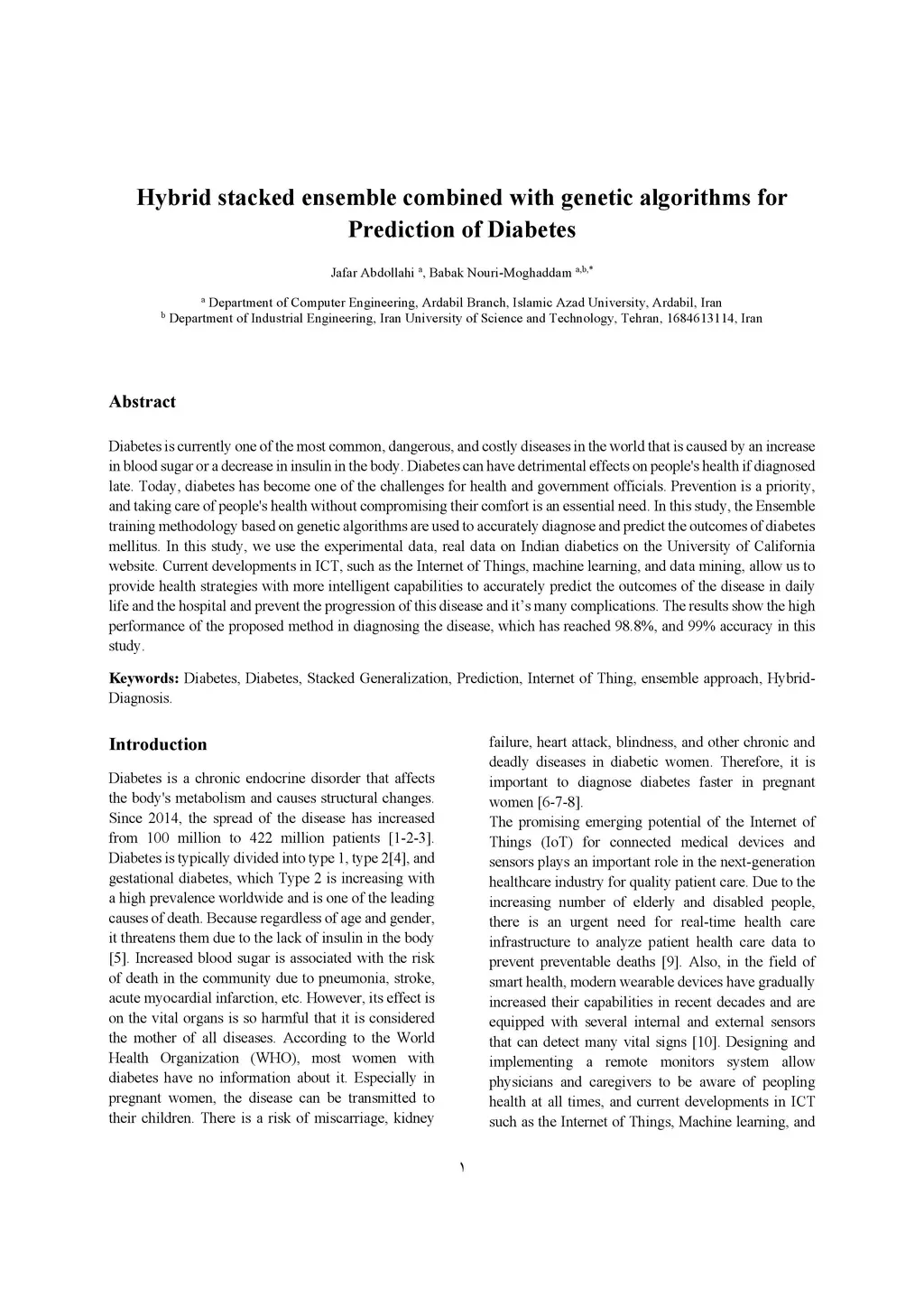 Diabetes is currently one of the most common, dangerous, and costly diseases in the world that is caused by an increase in blood sugar or a decrease in insulin in the body. Diabetes can have detrimental effects on people's health if diagnosed late. Today, diabetes has become one of the challenges for health and government officials. Prevention is a priority, and taking care of people's health without compromising their comfort is an essential need. In this study, the Ensemble training methodology based on genetic algorithms are used to accurately diagnose and predict the outcomes of diabetes mellitus. In this study, we use the experimental data, real data on Indian diabetics on the University of California website. Current developments in ICT, such as the Internet of Things, machine learning, and data mining, allow us to provide health strategies with more intelligent capabilities to accurately predict the outcomes of the disease in daily life and the hospital and prevent the progression of this disease and its many complications. The results show the high performance of the proposed method in diagnosing the disease, which has reached 98.8%, and 99% accuracy in this study.