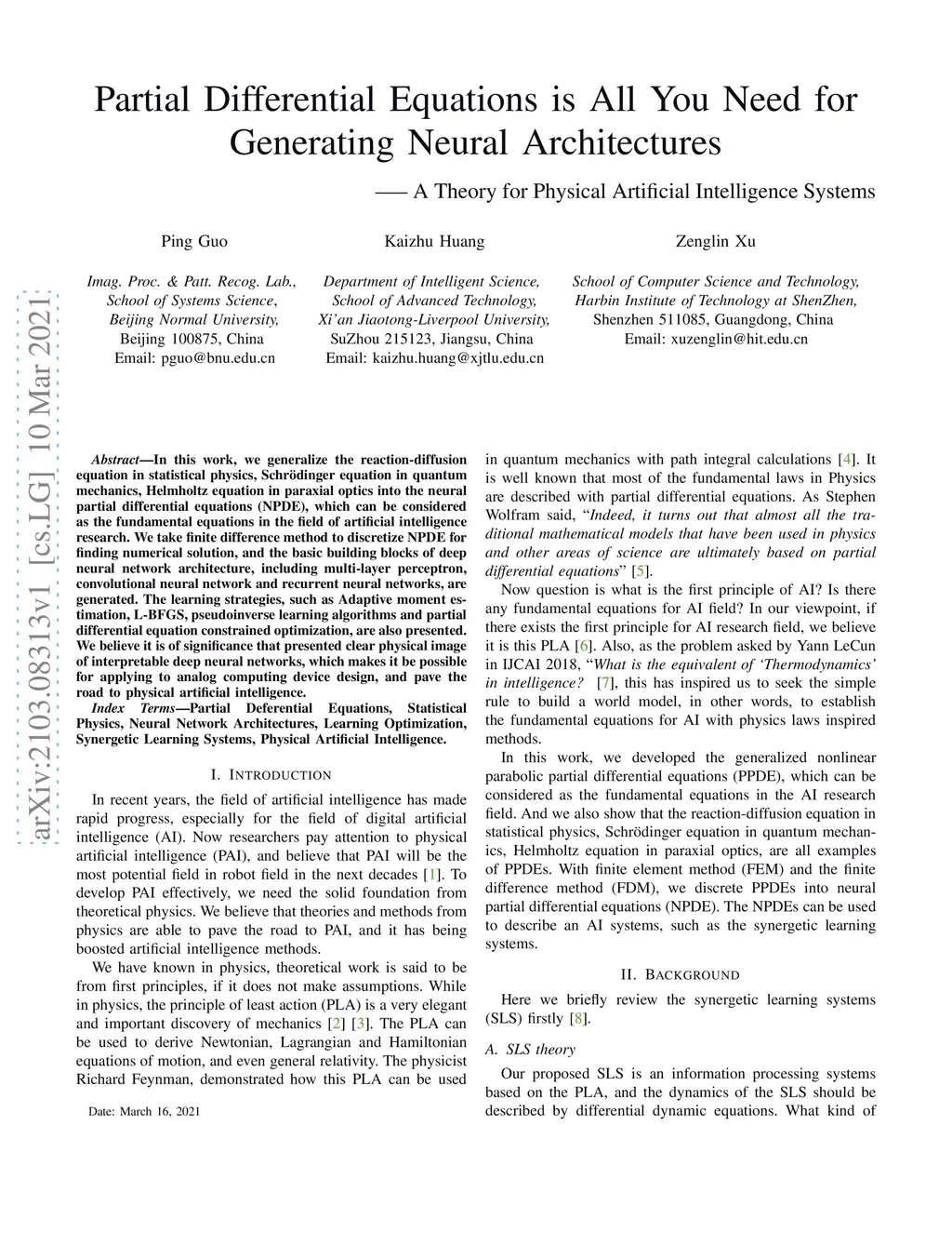 In this work, we generalize the reaction-diffusion equation in statistical physics, Schr\"odinger equation in quantum mechanics, Helmholtz equation in paraxial optics into the neural partial differential equations (NPDE), which can be considered as the fundamental equations in the field of artificial intelligence research. We take finite difference method to discretize NPDE for finding numerical solution, and the basic building blocks of deep neural network architecture, including multi-layer perceptron, convolutional neural network and recurrent neural networks, are generated. The learning strategies, such as Adaptive moment estimation, L-BFGS, pseudoinverse learning algorithms and partial differential equation constrained optimization, are also presented. We believe it is of significance that presented clear physical image of interpretable deep neural networks, which makes it be possible for applying to analog computing device design, and pave the road to physical artificial intelligence.