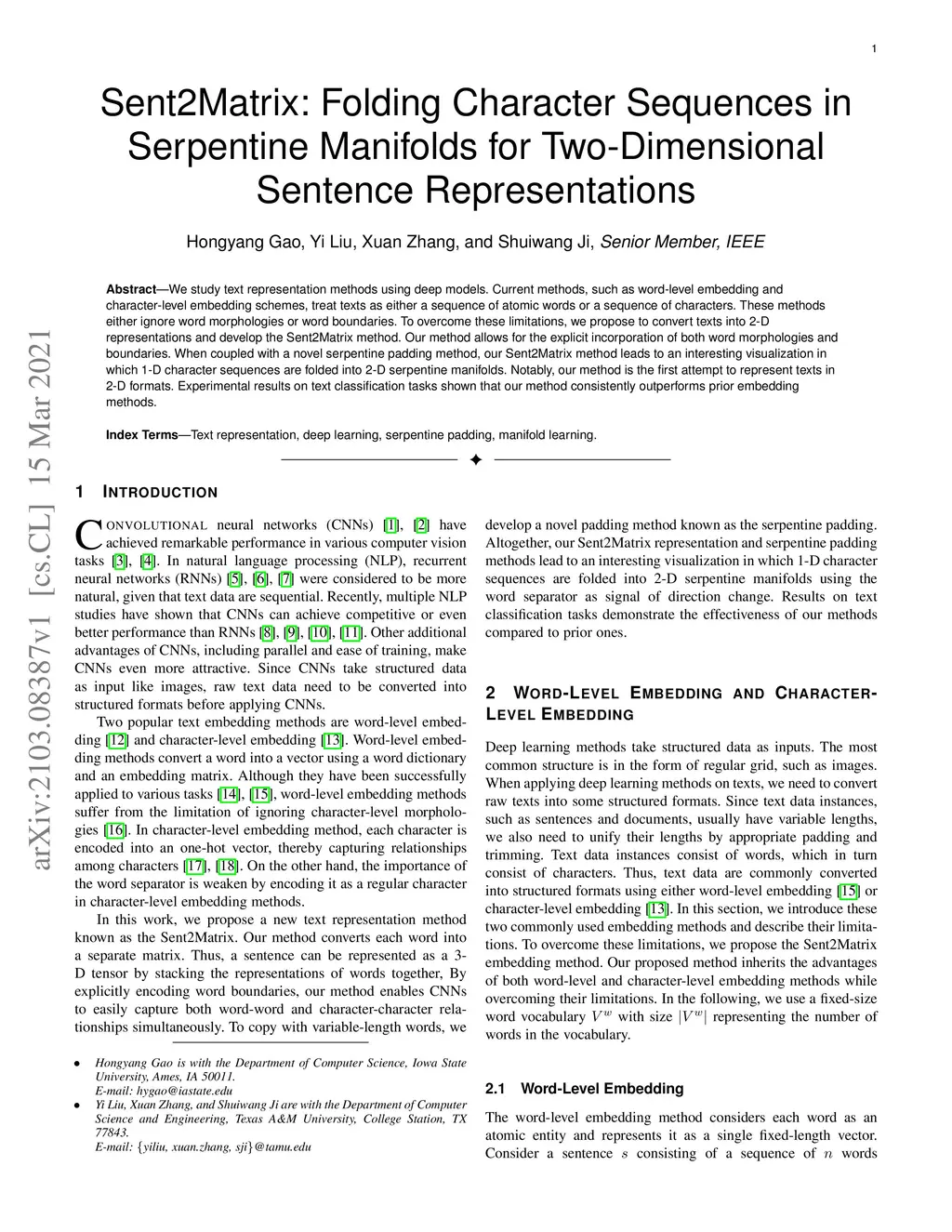We study text representation methods using deep models. Current methods, such as word-level embedding and character-level embedding schemes, treat texts as either a sequence of atomic words or a sequence of characters. These methods either ignore word morphologies or word boundaries. To overcome these limitations, we propose to convert texts into 2-D representations and develop the Sent2Matrix method. Our method allows for the explicit incorporation of both word morphologies and boundaries. When coupled with a novel serpentine padding method, our Sent2Matrix method leads to an interesting visualization in which 1-D character sequences are folded into 2-D serpentine manifolds. Notably, our method is the first attempt to represent texts in 2-D formats. Experimental results on text classification tasks shown that our method consistently outperforms prior embedding methods.