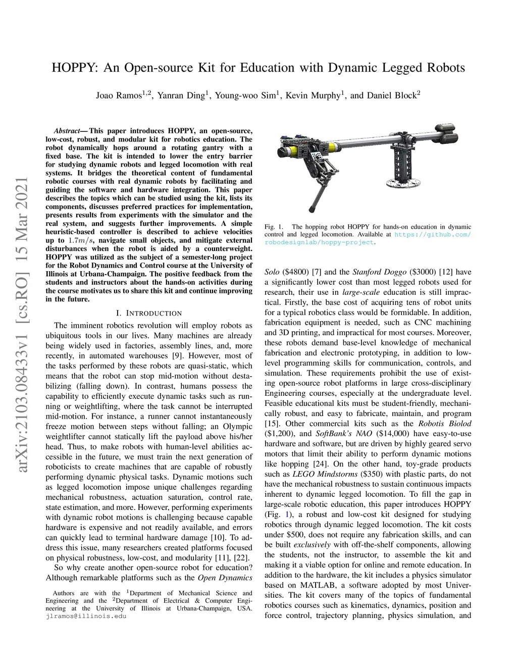 HOPPY: An Open-source Kit for Education with Dynamic Legged Robots