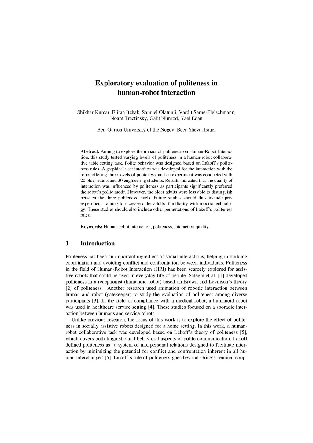 Aiming to explore the impact of politeness on Human robot interaction, this study tested varying levels of politeness in a human robot collaborative table setting task. Polite behaviour was designed based on the politeness rules of Lakoff. A graphical user interface was developed for the interaction with the robot offering three levels of politeness, and an experiment was conducted with 20 older adults and 30 engineering students. Results indicated that the quality of interaction was influenced by politeness as participants significantly preferred the polite mode of the robot. However, the older adults were less able to distinguish between the three politeness levels. Future studies should thus include pre experiment training to increase the familiarity of the older adults with robotic technology. These studies should also include other permutations of the politeness rules of Lakoff.