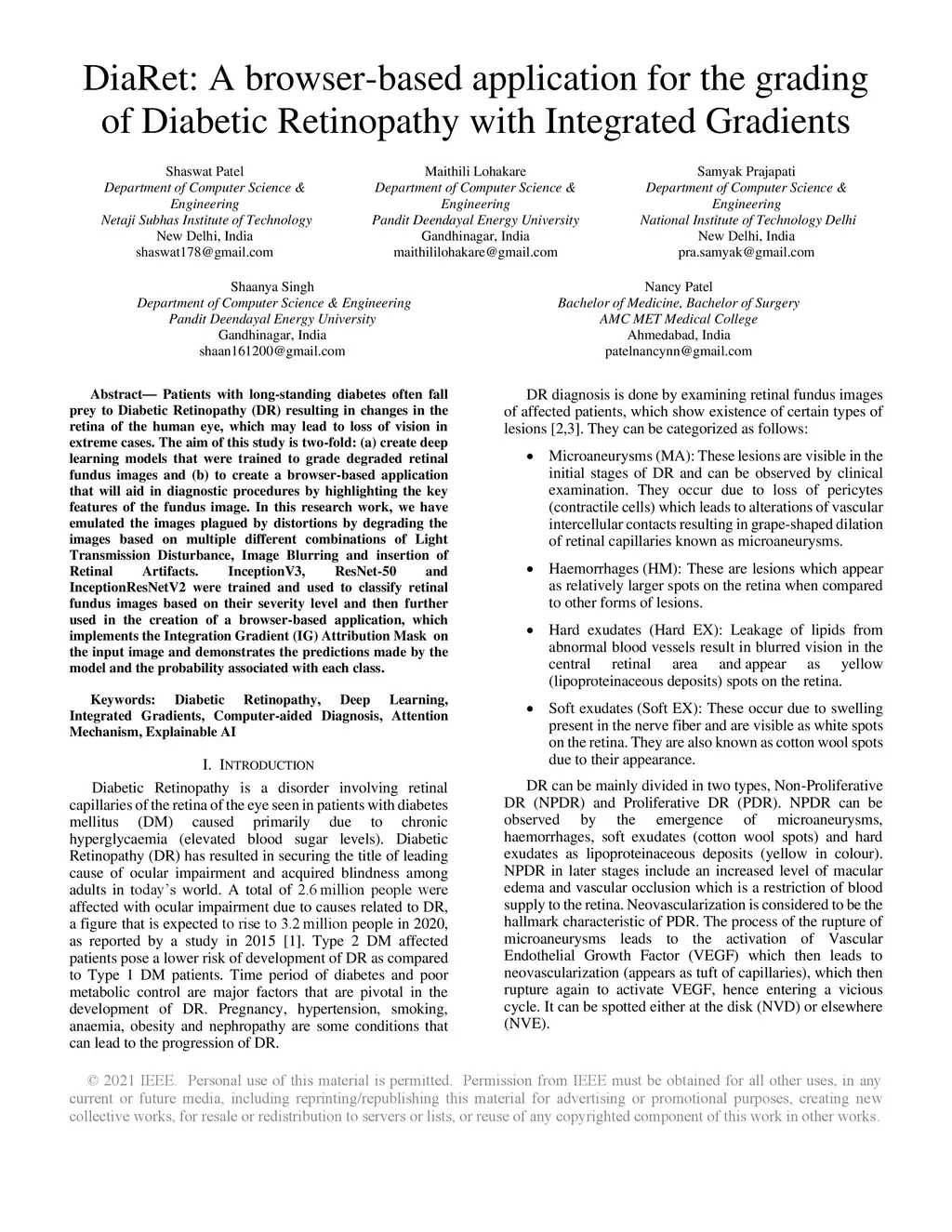 Patients with long-standing diabetes often fall prey to Diabetic Retinopathy (DR) resulting in changes in the retina of the human eye, which may lead to loss of vision in extreme cases. The aim of this study is two-fold: (a) create deep learning models that were trained to grade degraded retinal fundus images and (b) to create a browser-based application that will aid in diagnostic procedures by highlighting the key features of the fundus image. In this research work, we have emulated the images plagued by distortions by degrading the images based on multiple different combinations of Light Transmission Disturbance, Image Blurring and insertion of Retinal Artifacts. InceptionV3, ResNet-50 and InceptionResNetV2 were trained and used to classify retinal fundus images based on their severity level and then further used in the creation of a browser-based application, which implements the Integration Gradient (IG) Attribution Mask on the input image and demonstrates the predictions made by the model and the probability associated with each class.