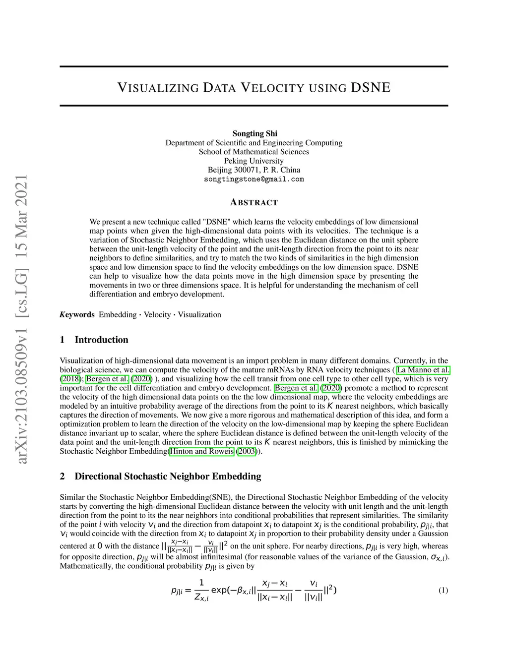 We present a new technique called "DSNE" which learns the velocity embeddings of low dimensional map points when given the high-dimensional data points with its velocities. The technique is a variation of Stochastic Neighbor Embedding, which uses the Euclidean distance on the unit sphere between the unit-length velocity of the point and the unit-length direction from the point to its near neighbors to define similarities, and try to match the two kinds of similarities in the high dimension space and low dimension space to find the velocity embeddings on the low dimension space. DSNE can help to visualize how the data points move in the high dimension space by presenting the movements in two or three dimensions space. It is helpful for understanding the mechanism of cell differentiation and embryo development.