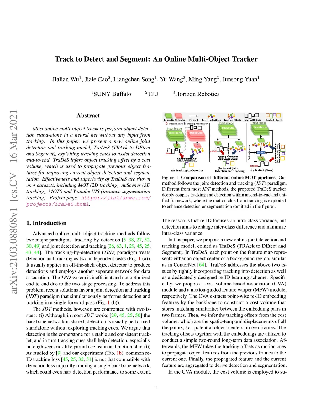 Most online multi-object trackers perform object detection stand-alone in a neural net without any input from tracking. In this paper, we present a new online joint detection and tracking model, TraDeS (TRAck to DEtect and Segment), exploiting tracking clues to assist detection end-to-end. TraDeS infers object tracking offset by a cost volume, which is used to propagate previous object features for improving current object detection and segmentation. Effectiveness and superiority of TraDeS are shown on 4 datasets, including MOT (2D tracking), nuScenes (3D tracking), MOTS and Youtube-VIS (instance segmentation tracking). Project page: https://jialianwu.com/projects/TraDeS.html.