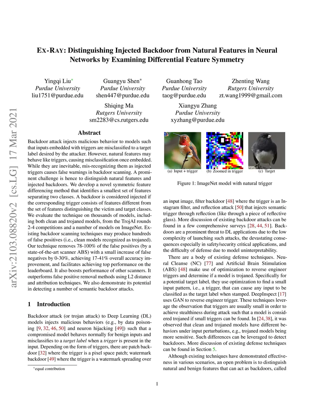 EX-RAY: Distinguishing Injected Backdoor from Natural Features in Neural