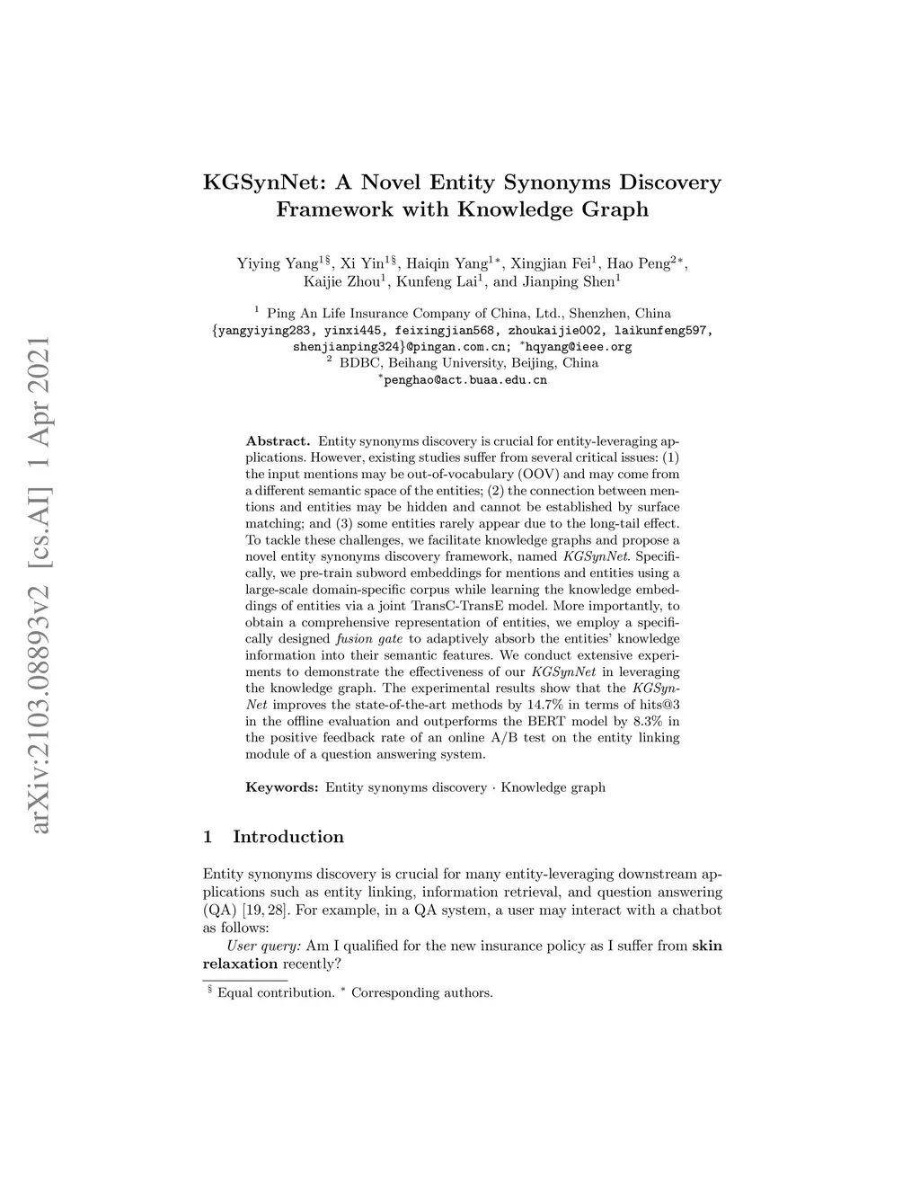 KGSynNet: A Novel Entity Synonyms Discovery Framework with Knowledge