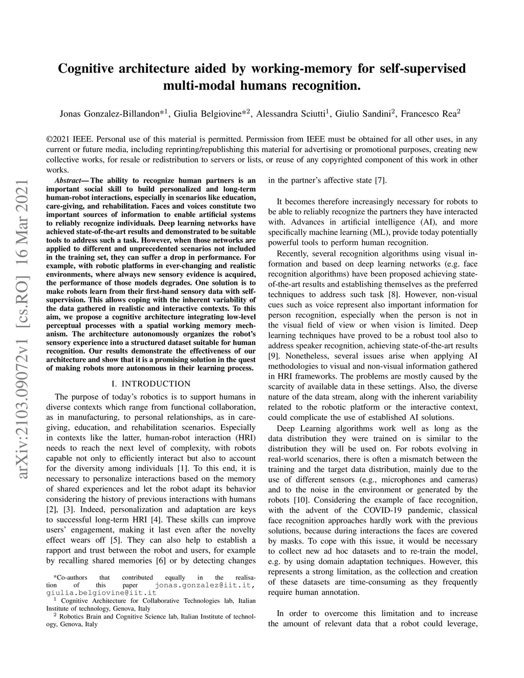The ability to recognize human partners is an important social skill to build personalized and long-term human-robot interactions, especially in scenarios like education, care-giving, and rehabilitation. Faces and voices constitute two important sources of information to enable artificial systems to reliably recognize individuals. Deep learning networks have achieved state-of-the-art results and demonstrated to be suitable tools to address such a task. However, when those networks are applied to different and unprecedented scenarios not included in the training set, they can suffer a drop in performance. For example, with robotic platforms in ever-changing and realistic environments, where always new sensory evidence is acquired, the performance of those models degrades. One solution is to make robots learn from their first-hand sensory data with self-supervision. This allows coping with the inherent variability of the data gathered in realistic and interactive contexts. To this aim, we propose a cognitive architecture integrating low-level perceptual processes with a spatial working memory mechanism. The architecture autonomously organizes the robot's sensory experience into a structured dataset suitable for human recognition. Our results demonstrate the effectiveness of our architecture and show that it is a promising solution in the quest of making robots more autonomous in their learning process.