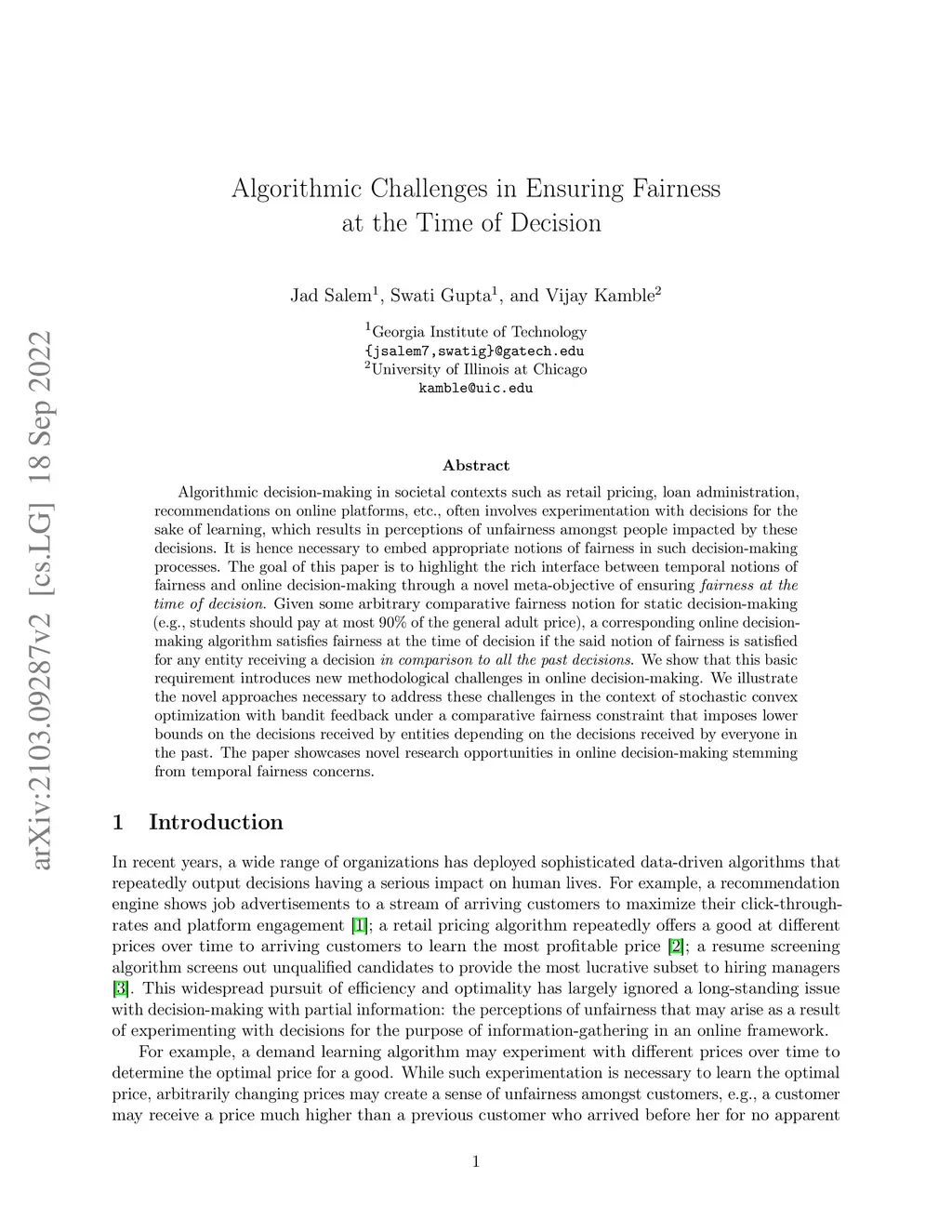 Algorithmic Challenges in Ensuring Fairness at the Time of Decision