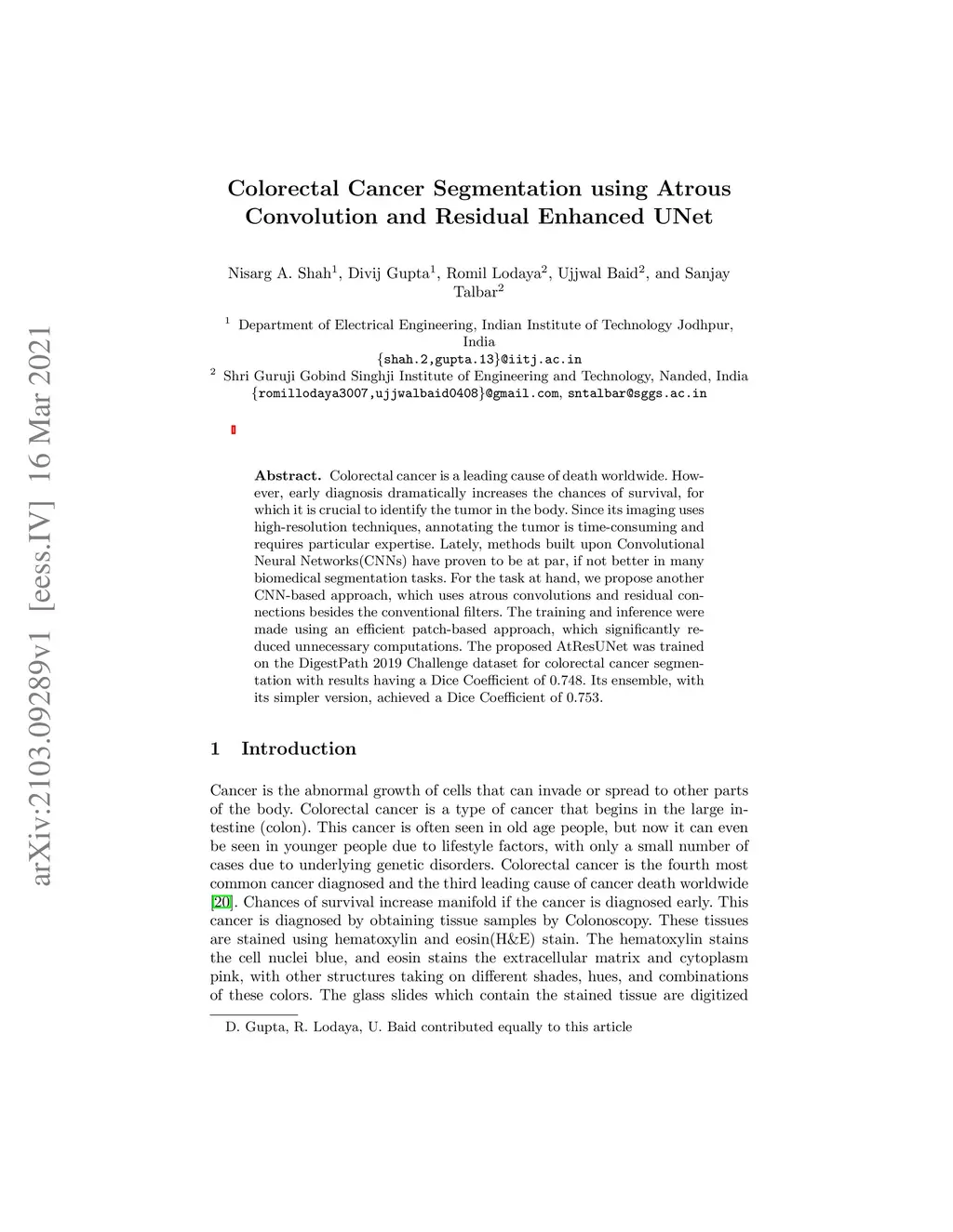 Colorectal Cancer Segmentation using Atrous Convolution and Residual