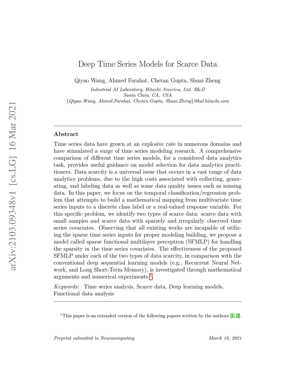 Time series data have grown at an explosive rate in numerous domains and have stimulated a surge of time series modeling research. A comprehensive comparison of different time series models, for a considered data analytics task, provides useful guidance on model selection for data analytics practitioners. Data scarcity is a universal issue that occurs in a vast range of data analytics problems, due to the high costs associated with collecting, generating, and labeling data as well as some data quality issues such as missing data. In this paper, we focus on the temporal classification/regression problem that attempts to build a mathematical mapping from multivariate time series inputs to a discrete class label or a real-valued response variable. For this specific problem, we identify two types of scarce data: scarce data with small samples and scarce data with sparsely and irregularly observed time series covariates. Observing that all existing works are incapable of utilizing the sparse time series inputs for proper modeling building, we propose a model called sparse functional multilayer perceptron (SFMLP) for handling the sparsity in the time series covariates. The effectiveness of the proposed SFMLP under each of the two types of data scarcity, in comparison with the conventional deep sequential learning models (e.g., Recurrent Neural Network, and Long Short-Term Memory), is investigated through mathematical arguments and numerical experiments.