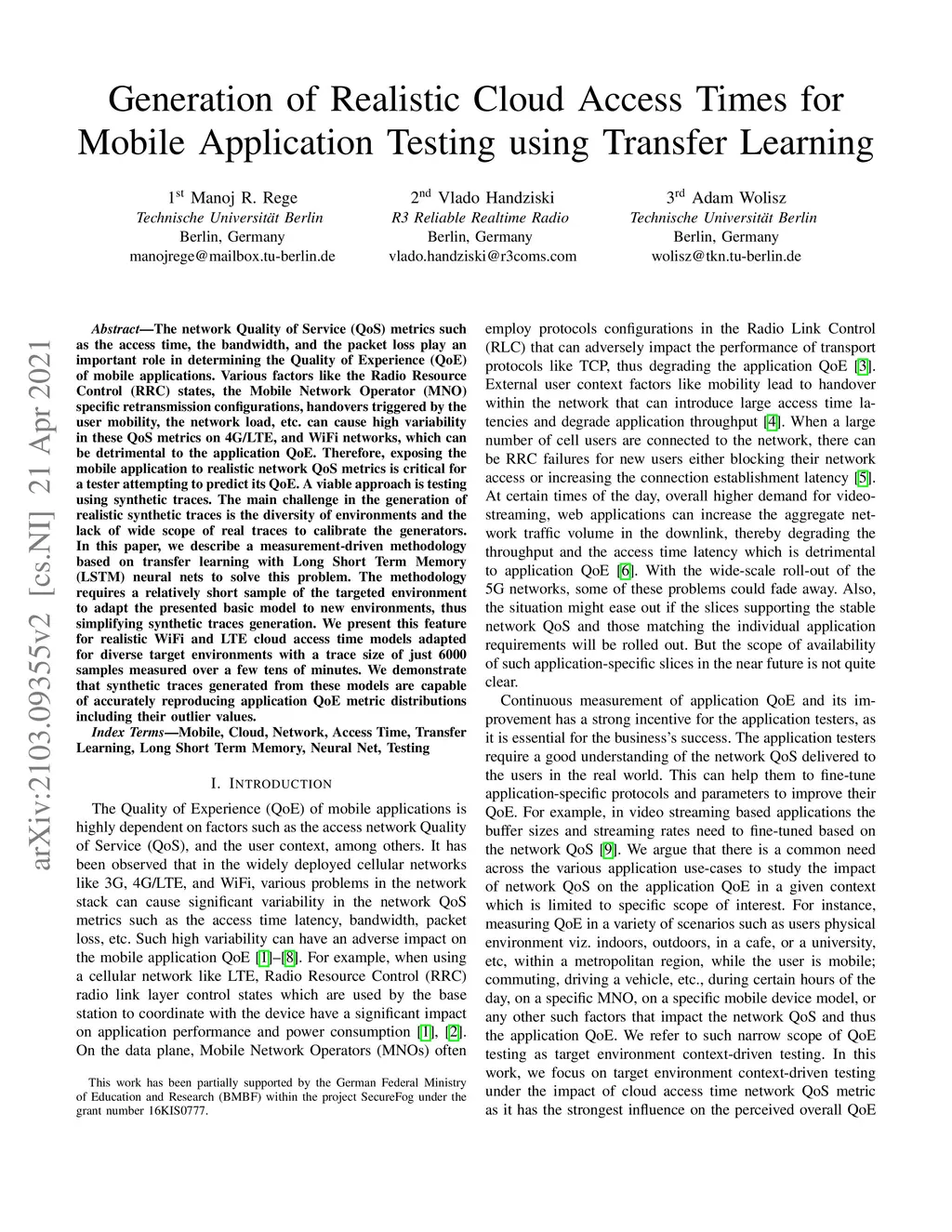 The network Quality of Service (QoS) metrics such as the access time, the bandwidth, and the packet loss play an important role in determining the Quality of Experience (QoE) of mobile applications. Various factors like the Radio Resource Control (RRC) states, the Mobile Network Operator (MNO) specific retransmission configurations, handovers triggered by the user mobility, the network load, etc. can cause high variability in these QoS metrics on 4G/LTE, and WiFi networks, which can be detrimental to the application QoE. Therefore, exposing the mobile application to realistic network QoS metrics is critical for a tester attempting to predict its QoE. A viable approach is testing using synthetic traces. The main challenge in the generation of realistic synthetic traces is the diversity of environments and the lack of wide scope of real traces to calibrate the generators. In this paper, we describe a measurement-driven methodology based on transfer learning with Long Short Term Memory (LSTM) neural nets to solve this problem. The methodology requires a relatively short sample of the targeted environment to adapt the presented basic model to new environments, thus simplifying synthetic traces generation. We present this feature for realistic WiFi and LTE cloud access time models adapted for diverse target environments with a trace size of just 6000 samples measured over a few tens of minutes. We demonstrate that synthetic traces generated from these models are capable of accurately reproducing application QoE metric distributions including their outlier values.