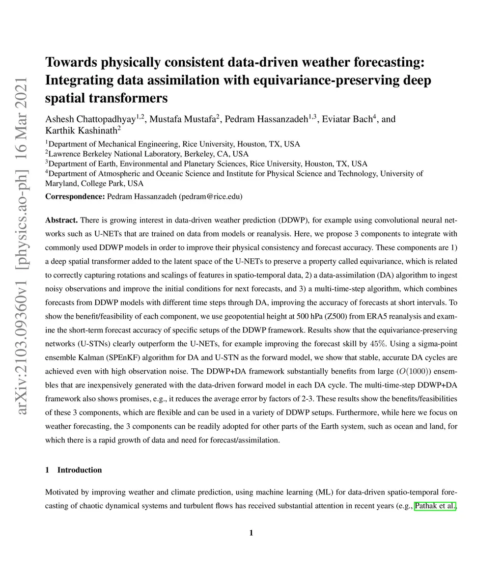 There is growing interest in data-driven weather prediction (DDWP), for example using convolutional neural networks such as U-NETs that are trained on data from models or reanalysis. Here, we propose 3 components to integrate with commonly used DDWP models in order to improve their physical consistency and forecast accuracy. These components are 1) a deep spatial transformer added to the latent space of the U-NETs to preserve a property called equivariance, which is related to correctly capturing rotations and scalings of features in spatio-temporal data, 2) a data-assimilation (DA) algorithm to ingest noisy observations and improve the initial conditions for next forecasts, and 3) a multi-time-step algorithm, which combines forecasts from DDWP models with different time steps through DA, improving the accuracy of forecasts at short intervals. To show the benefit/feasibility of each component, we use geopotential height at 500~hPa (Z500) from ERA5 reanalysis and examine the short-term forecast accuracy of specific setups of the DDWP framework. Results show that the equivariance-preserving networks (U-STNs) clearly outperform the U-NETs, for example improving the forecast skill by . Using a sigma-point ensemble Kalman (SPEnKF) algorithm for DA and U-STN as the forward model, we show that stable, accurate DA cycles are achieved even with high observation noise. The DDWP+DA framework substantially benefits from large () ensembles that are inexpensively generated with the data-driven forward model in each DA cycle. The multi-time-step DDWP+DA framework also shows promises, e.g., it reduces the average error by factors of 2-3.