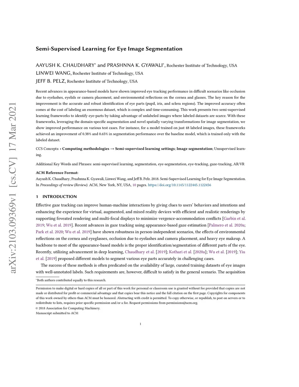 Recent advances in appearance-based models have shown improved eye tracking performance in difficult scenarios like occlusion due to eyelashes, eyelids or camera placement, and environmental reflections on the cornea and glasses. The key reason for the improvement is the accurate and robust identification of eye parts (pupil, iris, and sclera regions). The improved accuracy often comes at the cost of labeling an enormous dataset, which is complex and time-consuming. This work presents two semi-supervised learning frameworks to identify eye-parts by taking advantage of unlabeled images where labeled datasets are scarce. With these frameworks, leveraging the domain-specific augmentation and novel spatially varying transformations for image segmentation, we show improved performance on various test cases. For instance, for a model trained on just 48 labeled images, these frameworks achieved an improvement of 0.38% and 0.65% in segmentation performance over the baseline model, which is trained only with the labeled dataset.