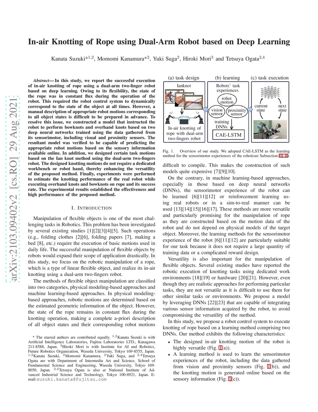 In-air Knotting of Rope using Dual-Arm Robot based on Deep Learning
