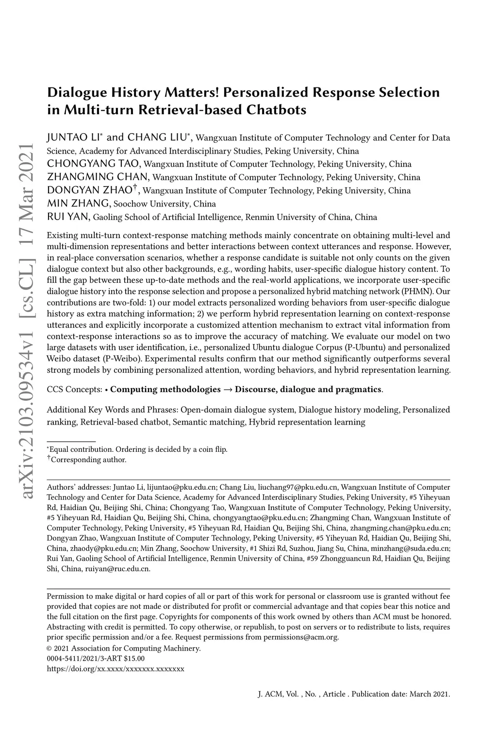 Dialogue History Matters! Personalized Response Selectionin Multi-turn