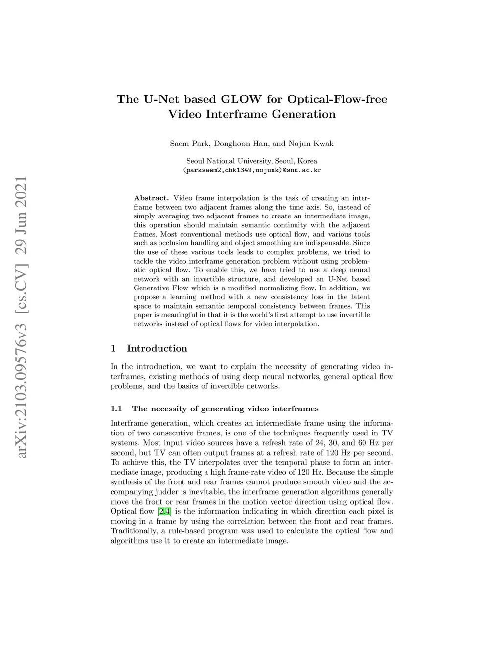 The U-Net based GLOW for Optical-Flow-free Video Interframe Generation