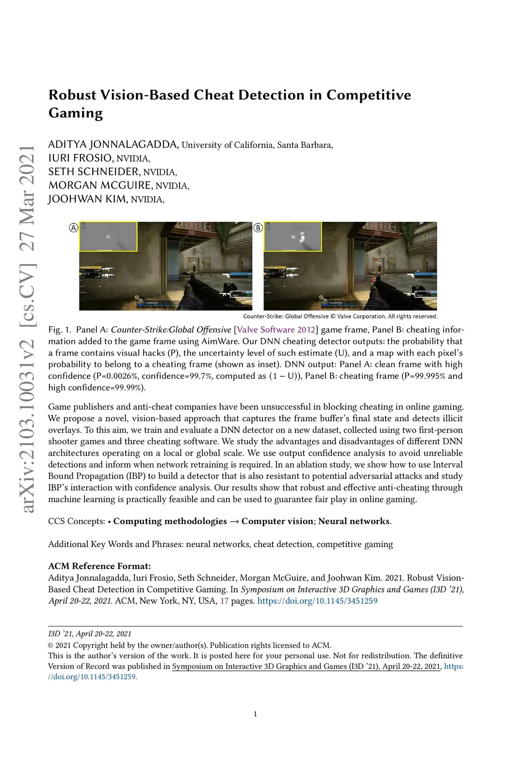 Game publishers and anti-cheat companies have been unsuccessful in blocking cheating in online gaming. We propose a novel, vision-based approach that captures the final state of the frame buffer and detects illicit overlays. To this aim, we train and evaluate a DNN detector on a new dataset, collected using two first-person shooter games and three cheating software. We study the advantages and disadvantages of different DNN architectures operating on a local or global scale. We use output confidence analysis to avoid unreliable detections and inform when network retraining is required. In an ablation study, we show how to use Interval Bound Propagation to build a detector that is also resistant to potential adversarial attacks and study its interaction with confidence analysis. Our results show that robust and effective anti-cheating through machine learning is practically feasible and can be used to guarantee fair play in online gaming.