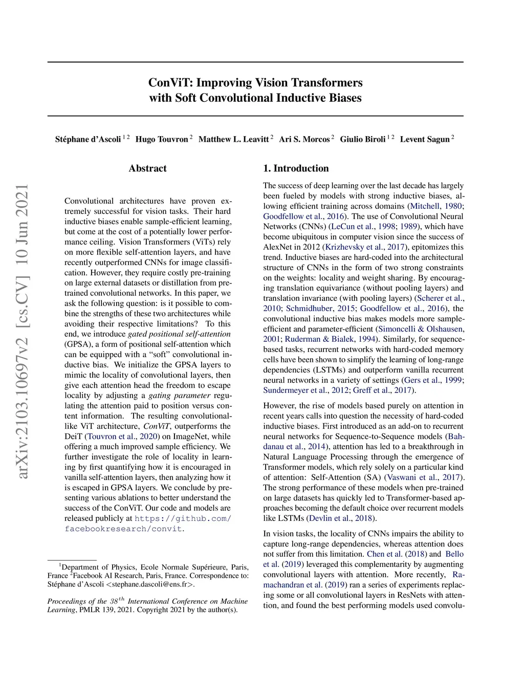 Convolutional architectures have proven extremely successful for vision tasks. Their hard inductive biases enable sample-efficient learning, but come at the cost of a potentially lower performance ceiling. Vision Transformers (ViTs) rely on more flexible self-attention layers, and have recently outperformed CNNs for image classification. However, they require costly pre-training on large external datasets or distillation from pre-trained convolutional networks. In this paper, we ask the following question: is it possible to combine the strengths of these two architectures while avoiding their respective limitations? To this end, we introduce gated positional self-attention (GPSA), a form of positional self-attention which can be equipped with a ``soft" convolutional inductive bias. We initialise the GPSA layers to mimic the locality of convolutional layers, then give each attention head the freedom to escape locality by adjusting a gating parameter regulating the attention paid to position versus content information. The resulting convolutional-like ViT architecture, ConViT, outperforms the DeiT on ImageNet, while offering a much improved sample efficiency. We further investigate the role of locality in learning by first quantifying how it is encouraged in vanilla self-attention layers, then analysing how it is escaped in GPSA layers. We conclude by presenting various ablations to better understand the success of the ConViT. Our code and models are released publicly at https://github.com/facebookresearch/convit.