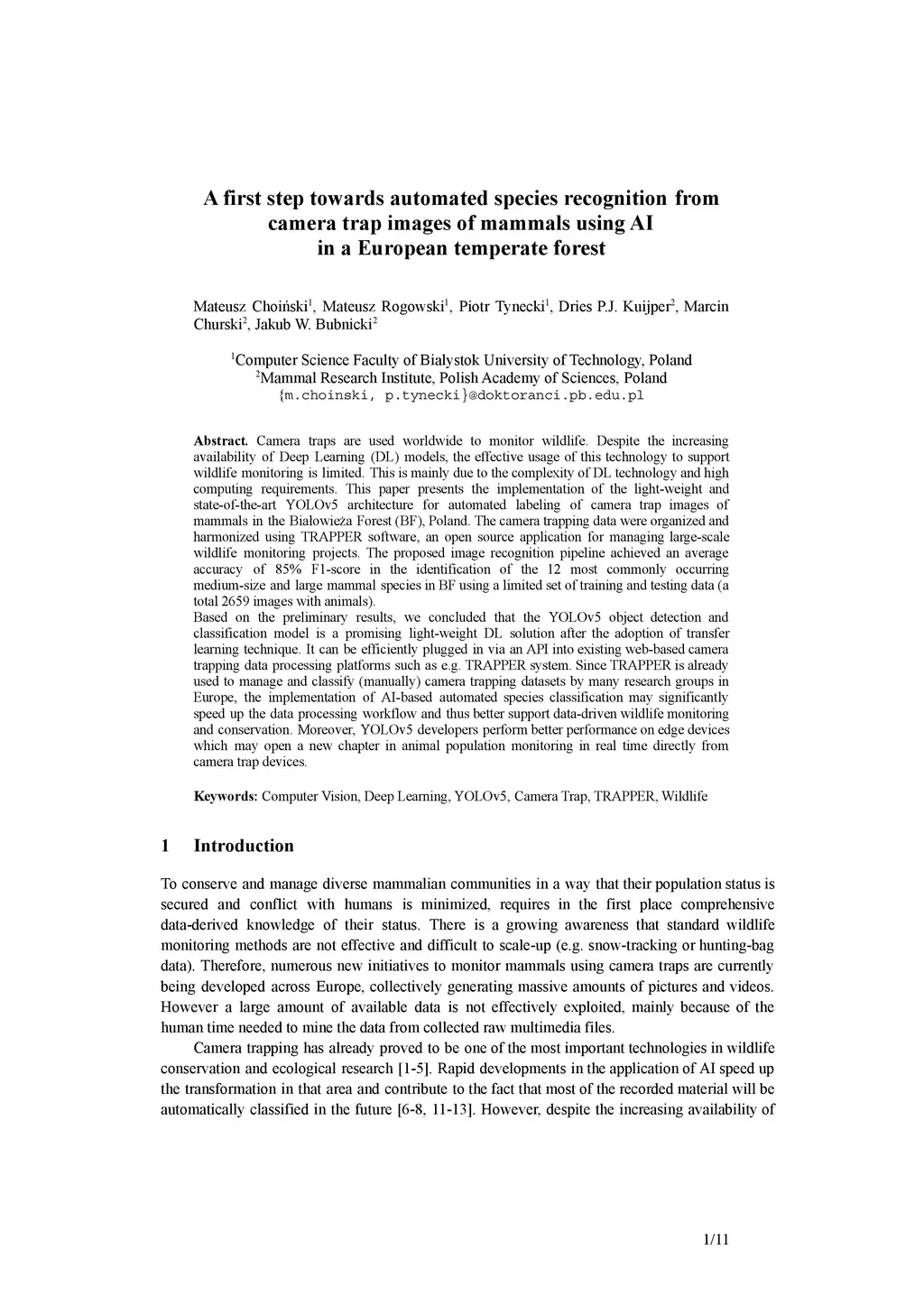 Camera traps are used worldwide to monitor wildlife. Despite the increasing availability of Deep Learning (DL) models, the effective usage of this technology to support wildlife monitoring is limited. This is mainly due to the complexity of DL technology and high computing requirements. This paper presents the implementation of the light-weight and state-of-the-art YOLOv5 architecture for automated labeling of camera trap images of mammals in the Bialowieza Forest (BF), Poland. The camera trapping data were organized and harmonized using TRAPPER software, an open source application for managing large-scale wildlife monitoring projects. The proposed image recognition pipeline achieved an average accuracy of 85% F1-score in the identification of the 12 most commonly occurring medium-size and large mammal species in BF using a limited set of training and testing data (a total 2659 images with animals). Based on the preliminary results, we concluded that the YOLOv5 object detection and classification model is a promising light-weight DL solution after the adoption of transfer learning technique. It can be efficiently plugged in via an API into existing web-based camera trapping data processing platforms such as e.g. TRAPPER system. Since TRAPPER is already used to manage and classify (manually) camera trapping datasets by many research groups in Europe, the implementation of AI-based automated species classification may significantly speed up the data processing workflow and thus better support data-driven wildlife monitoring and conservation. Moreover, YOLOv5 developers perform better performance on edge devices which may open a new chapter in animal population monitoring in real time directly from camera trap devices.