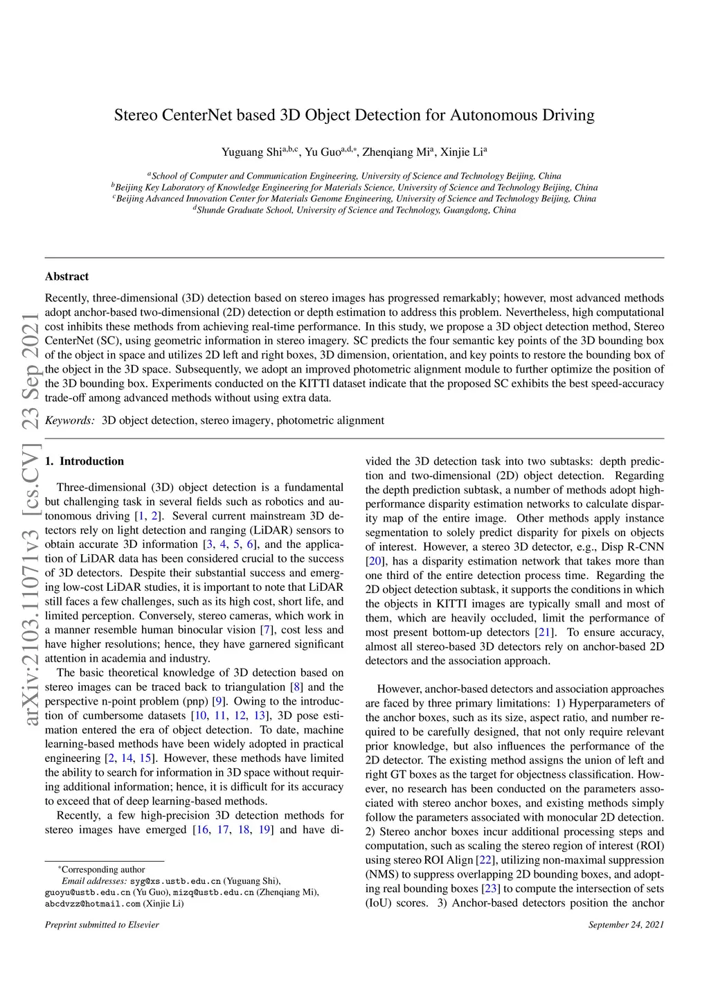 Recently, three-dimensional (3D) detection based on stereo images has progressed remarkably; however, most advanced methods adopt anchor-based two-dimensional (2D) detection or depth estimation to address this problem. Nevertheless, high computational cost inhibits these methods from achieving real-time performance. In this study, we propose a 3D object detection method, Stereo CenterNet (SC), using geometric information in stereo imagery. SC predicts the four semantic key points of the 3D bounding box of the object in space and utilizes 2D left and right boxes, 3D dimension, orientation, and key points to restore the bounding box of the object in the 3D space. Subsequently, we adopt an improved photometric alignment module to further optimize the position of the 3D bounding box. Experiments conducted on the KITTI dataset indicate that the proposed SC exhibits the best speed-accuracy trade-off among advanced methods without using extra data.