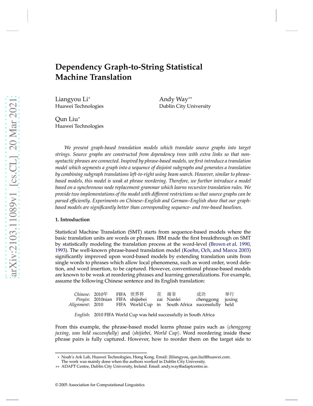 Dependency Graph-to-String Statistical Machine Translation