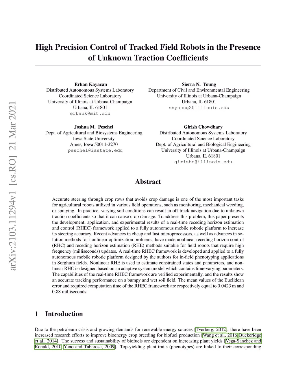 Accurate steering through crop rows that avoids crop damage is one of the most important tasks for agricultural robots utilized in various field operations, such as monitoring, mechanical weeding, or spraying. In practice, varying soil conditions can result in off-track navigation due to unknown traction coefficients so that it can cause crop damage. To address this problem, this paper presents the development, application, and experimental results of a real-time receding horizon estimation and control (RHEC) framework applied to a fully autonomous mobile robotic platform to increase its steering accuracy. Recent advances in cheap and fast microprocessors, as well as advances in solution methods for nonlinear optimization problems, have made nonlinear receding horizon control (RHC) and receding horizon estimation (RHE) methods suitable for field robots that require high frequency (milliseconds) updates. A real-time RHEC framework is developed and applied to a fully autonomous mobile robotic platform designed by the authors for in-field phenotyping applications in Sorghum fields. Nonlinear RHE is used to estimate constrained states and parameters, and nonlinear RHC is designed based on an adaptive system model which contains time-varying parameters. The capabilities of the real-time RHEC framework are verified experimentally, and the results show an accurate tracking performance on a bumpy and wet soil field. The mean values of the Euclidean error and required computation time of the RHEC framework are respectively equal to m and milliseconds.