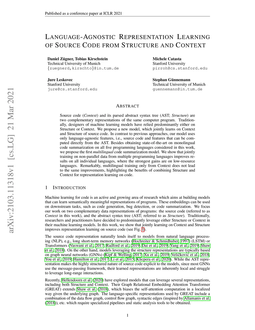 Source code (Context) and its parsed abstract syntax tree (AST; Structure) are two complementary representations of the same computer program. Traditionally, designers of machine learning models have relied predominantly either on Structure or Context. We propose a new model, which jointly learns on Context and Structure of source code. In contrast to previous approaches, our model uses only language-agnostic features, i.e., source code and features that can be computed directly from the AST. Besides obtaining state-of-the-art on monolingual code summarization on all five programming languages considered in this work, we propose the first multilingual code summarization model. We show that jointly training on non-parallel data from multiple programming languages improves results on all individual languages, where the strongest gains are on low-resource languages. Remarkably, multilingual training only from Context does not lead to the same improvements, highlighting the benefits of combining Structure and Context for representation learning on code.