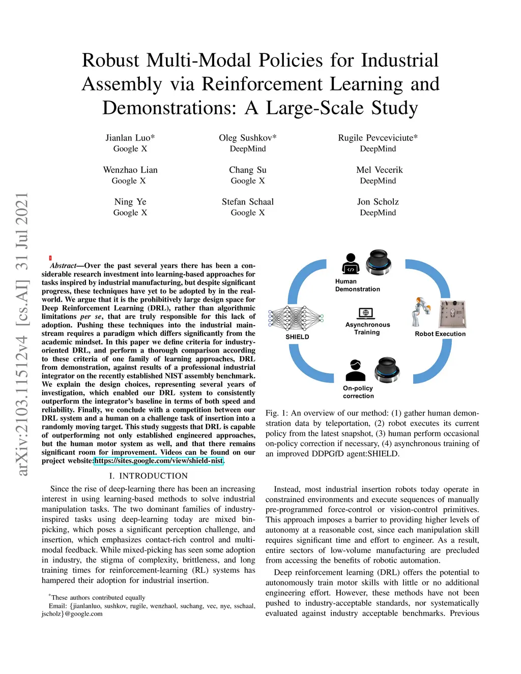 Over the past several years there has been a considerable research investment into learning-based approaches to industrial assembly, but despite significant progress these techniques have yet to be adopted by industry. We argue that it is the prohibitively large design space for Deep Reinforcement Learning (DRL), rather than algorithmic limitations per se, that are truly responsible for this lack of adoption. Pushing these techniques into the industrial mainstream requires an industry-oriented paradigm which differs significantly from the academic mindset. In this paper we define criteria for industry-oriented DRL, and perform a thorough comparison according to these criteria of one family of learning approaches, DRL from demonstration, against a professional industrial integrator on the recently established NIST assembly benchmark. We explain the design choices, representing several years of investigation, which enabled our DRL system to consistently outperform the integrator baseline in terms of both speed and reliability. Finally, we conclude with a competition between our DRL system and a human on a challenge task of insertion into a randomly moving target. This study suggests that DRL is capable of outperforming not only established engineered approaches, but the human motor system as well, and that there remains significant room for improvement. Videos can be found on our project website: https://sites.google.com/view/shield-nist.