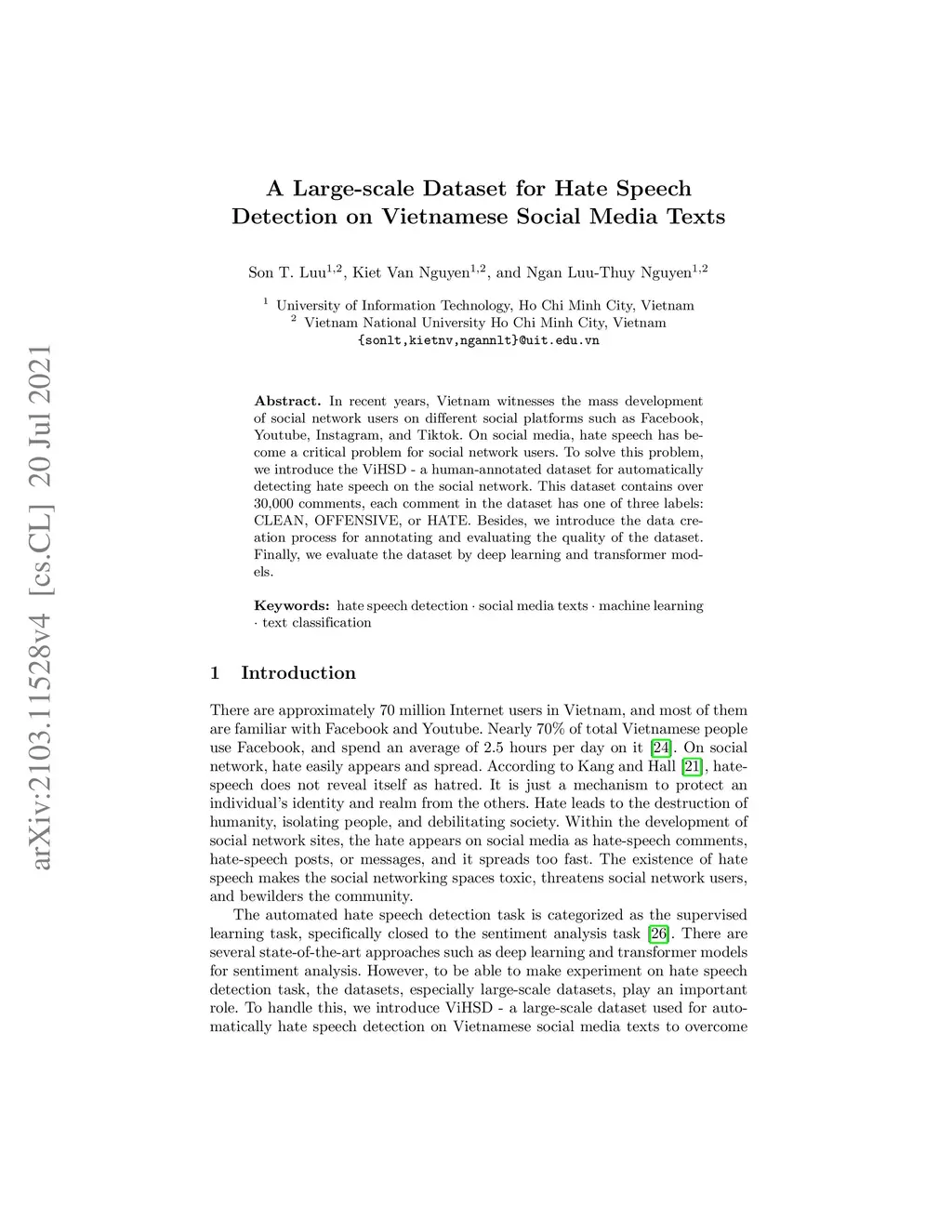 A Large-scale Dataset for Hate Speech Detection on Vietnamese Social