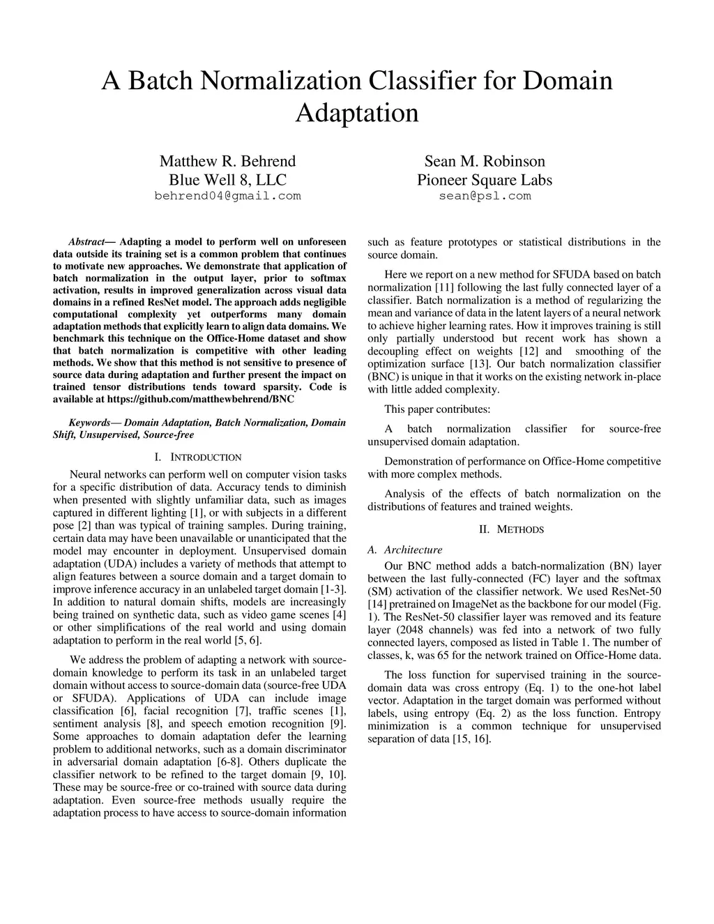Adapting a model to perform well on unforeseen data outside its training set is a common problem that continues to motivate new approaches. We demonstrate that application of batch normalization in the output layer, prior to softmax activation, results in improved generalization across visual data domains in a refined ResNet model. The approach adds negligible computational complexity yet outperforms many domain adaptation methods that explicitly learn to align data domains. We benchmark this technique on the Office-Home dataset and show that batch normalization is competitive with other leading methods. We show that this method is not sensitive to presence of source data during adaptation and further present the impact on trained tensor distributions tends toward sparsity. Code is available at https://github.com/matthewbehrend/BNC