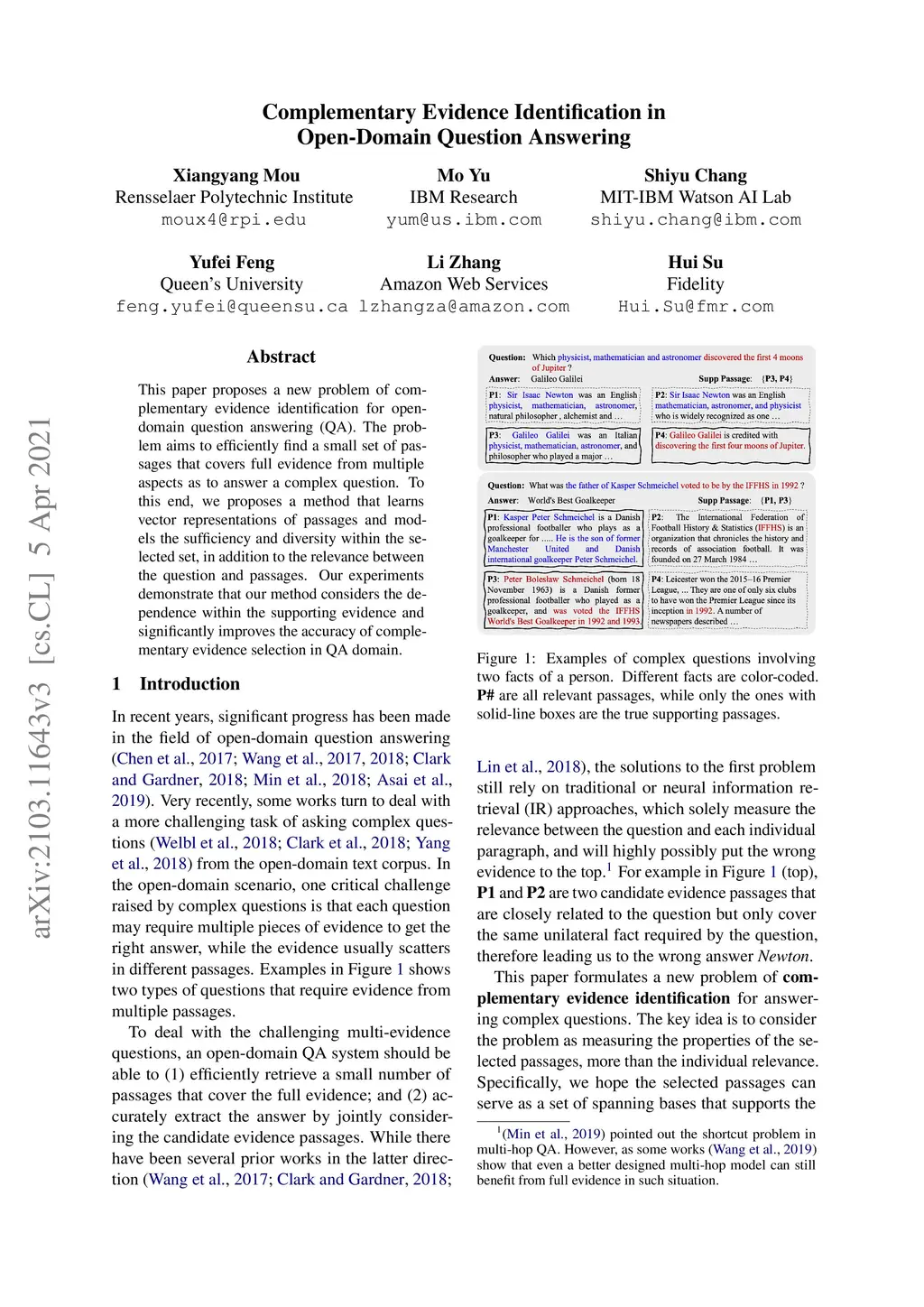 This paper proposes a new problem of complementary evidence identification for open-domain question answering (QA). The problem aims to efficiently find a small set of passages that covers full evidence from multiple aspects as to answer a complex question. To this end, we proposes a method that learns vector representations of passages and models the sufficiency and diversity within the selected set, in addition to the relevance between the question and passages. Our experiments demonstrate that our method considers the dependence within the supporting evidence and significantly improves the accuracy of complementary evidence selection in QA domain.
