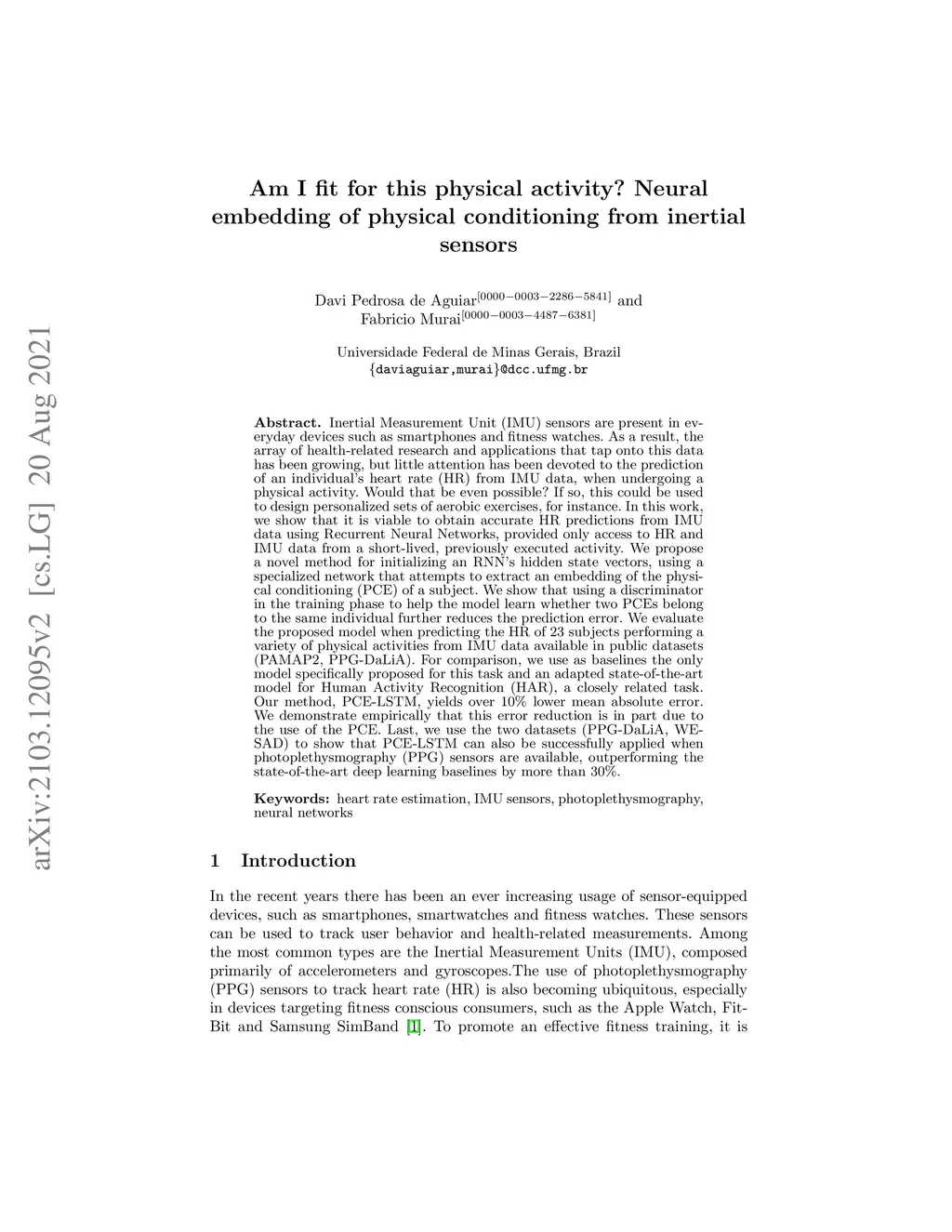Inertial Measurement Unit (IMU) sensors are present in everyday devices such as smartphones and fitness watches. As a result, the array of health-related research and applications that tap onto this data has been growing, but little attention has been devoted to the prediction of an individual's heart rate (HR) from IMU data, when undergoing a physical activity. Would that be even possible? If so, this could be used to design personalized sets of aerobic exercises, for instance. In this work, we show that it is viable to obtain accurate HR predictions from IMU data using Recurrent Neural Networks, provided only access to HR and IMU data from a short-lived, previously executed activity. We propose a novel method for initializing an RNN's hidden state vectors, using a specialized network that attempts to extract an embedding of the physical conditioning (PCE) of a subject. We show that using a discriminator in the training phase to help the model learn whether two PCEs belong to the same individual further reduces the prediction error. We evaluate the proposed model when predicting the HR of 23 subjects performing a variety of physical activities from IMU data available in public datasets (PAMAP2, PPG-DaLiA). For comparison, we use as baselines the only model specifically proposed for this task and an adapted state-of-the-art model for Human Activity Recognition (HAR), a closely related task. Our method, PCE-LSTM, yields over 10% lower mean absolute error. We demonstrate empirically that this error reduction is in part due to the use of the PCE. Last, we use the two datasets (PPG-DaLiA, WESAD) to show that PCE-LSTM can also be successfully applied when photoplethysmography (PPG) sensors are available, outperforming the state-of-the-art deep learning baselines by more than 30%.