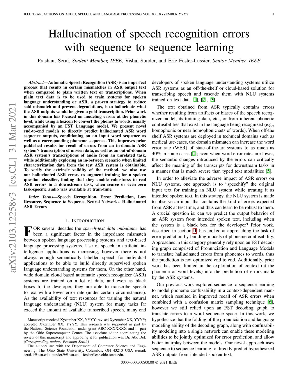 Automatic Speech Recognition (ASR) is an imperfect process that results in certain mismatches in ASR output text when compared to plain written text or transcriptions. When plain text data is to be used to train systems for spoken language understanding or ASR, a proven strategy to reduce said mismatch and prevent degradations, is to hallucinate what the ASR outputs would be given a gold transcription. Prior work in this domain has focused on modeling errors at the phonetic level, while using a lexicon to convert the phones to words, usually accompanied by an FST Language model. We present novel end-to-end models to directly predict hallucinated ASR word sequence outputs, conditioning on an input word sequence as well as a corresponding phoneme sequence. This improves prior published results for recall of errors from an in-domain ASR system's transcription of unseen data, as well as an out-of-domain ASR system's transcriptions of audio from an unrelated task, while additionally exploring an in-between scenario when limited characterization data from the test ASR system is obtainable. To verify the extrinsic validity of the method, we also use our hallucinated ASR errors to augment training for a spoken question classifier, finding that they enable robustness to real ASR errors in a downstream task, when scarce or even zero task-specific audio was available at train-time.