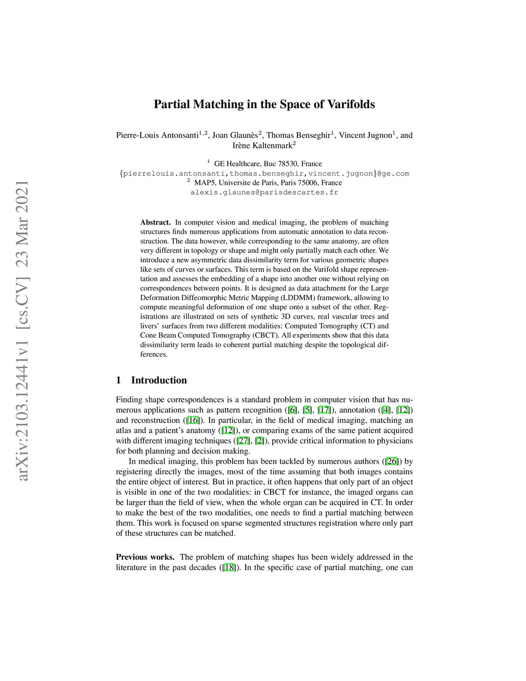 In computer vision and medical imaging, the problem of matching structures finds numerous applications from automatic annotation to data reconstruction. The data however, while corresponding to the same anatomy, are often very different in topology or shape and might only partially match each other. We introduce a new asymmetric data dissimilarity term for various geometric shapes like sets of curves or surfaces. This term is based on the Varifold shape representation and assesses the embedding of a shape into another one without relying on correspondences between points. It is designed as data attachment for the Large Deformation Diffeomorphic Metric Mapping (LDDMM) framework, allowing to compute meaningful deformation of one shape onto a subset of the other. Registrations are illustrated on sets of synthetic 3D curves, real vascular trees and livers' surfaces from two different modalities: Computed Tomography (CT) and Cone Beam Computed Tomography (CBCT). All experiments show that this data dissimilarity term leads to coherent partial matching despite the topological differences.