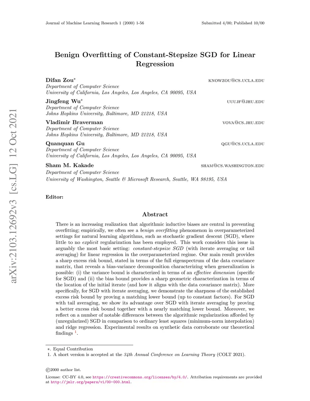 There is an increasing realization that algorithmic inductive biases are central in preventing overfitting; empirically, we often see a benign overfitting phenomenon in overparameterized settings for natural learning algorithms, such as stochastic gradient descent (SGD), where little to no explicit regularization has been employed. This work considers this issue in arguably the most basic setting: constant-stepsize SGD (with iterate averaging or tail averaging) for linear regression in the overparameterized regime. Our main result provides a sharp excess risk bound, stated in terms of the full eigenspectrum of the data covariance matrix, that reveals a bias-variance decomposition characterizing when generalization is possible: (i) the variance bound is characterized in terms of an effective dimension (specific for SGD) and (ii) the bias bound provides a sharp geometric characterization in terms of the location of the initial iterate (and how it aligns with the data covariance matrix). More specifically, for SGD with iterate averaging, we demonstrate the sharpness of the established excess risk bound by proving a matching lower bound (up to constant factors). For SGD with tail averaging, we show its advantage over SGD with iterate averaging by proving a better excess risk bound together with a nearly matching lower bound. Moreover, we reflect on a number of notable differences between the algorithmic regularization afforded by (unregularized) SGD in comparison to ordinary least squares (minimum-norm interpolation) and ridge regression. Experimental results on synthetic data corroborate our theoretical findings.