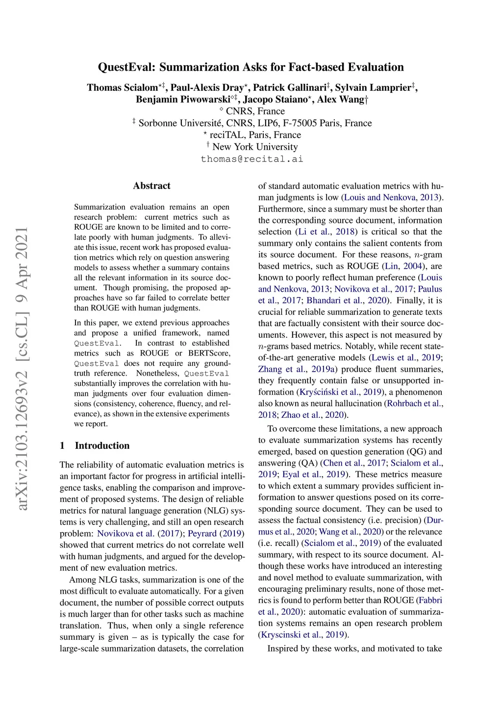 QuestEval: Summarization Asks for Fact-based Evaluation