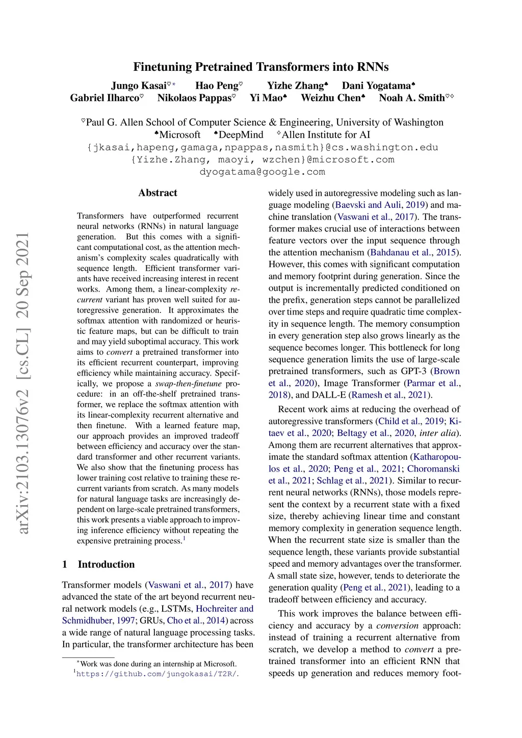 Transformers have outperformed recurrent neural networks (RNNs) in natural language generation. But this comes with a significant computational cost, as the attention mechanism's complexity scales quadratically with sequence length. Efficient transformer variants have received increasing interest in recent works. Among them, a linear-complexity recurrent variant has proven well suited for autoregressive generation. It approximates the softmax attention with randomized or heuristic feature maps, but can be difficult to train and may yield suboptimal accuracy. This work aims to convert a pretrained transformer into its efficient recurrent counterpart, improving efficiency while maintaining accuracy. Specifically, we propose a swap-then-finetune procedure: in an off-the-shelf pretrained transformer, we replace the softmax attention with its linear-complexity recurrent alternative and then finetune. With a learned feature map, our approach provides an improved tradeoff between efficiency and accuracy over the standard transformer and other recurrent variants. We also show that the finetuning process has lower training cost relative to training these recurrent variants from scratch. As many models for natural language tasks are increasingly dependent on large-scale pretrained transformers, this work presents a viable approach to improving inference efficiency without repeating the expensive pretraining process.