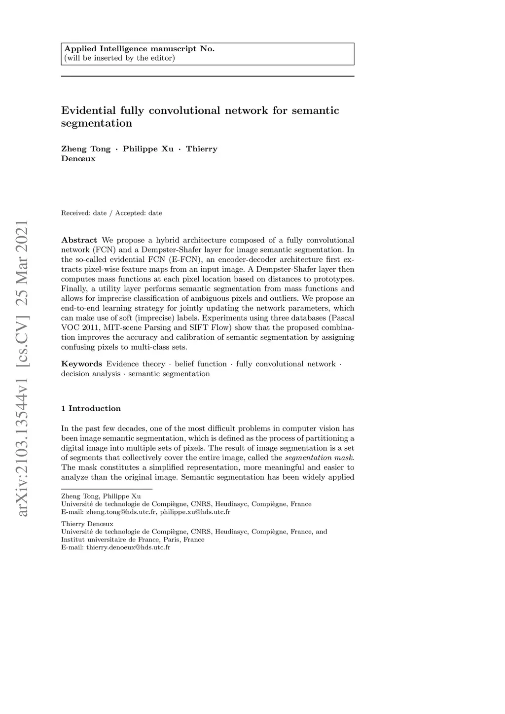We propose a hybrid architecture composed of a fully convolutional network (FCN) and a Dempster-Shafer layer for image semantic segmentation. In the so-called evidential FCN (E-FCN), an encoder-decoder architecture first extracts pixel-wise feature maps from an input image. A Dempster-Shafer layer then computes mass functions at each pixel location based on distances to prototypes. Finally, a utility layer performs semantic segmentation from mass functions and allows for imprecise classification of ambiguous pixels and outliers. We propose an end-to-end learning strategy for jointly updating the network parameters, which can make use of soft (imprecise) labels. Experiments using three databases (Pascal VOC 2011, MIT-scene Parsing and SIFT Flow) show that the proposed combination improves the accuracy and calibration of semantic segmentation by assigning confusing pixels to multi-class sets.