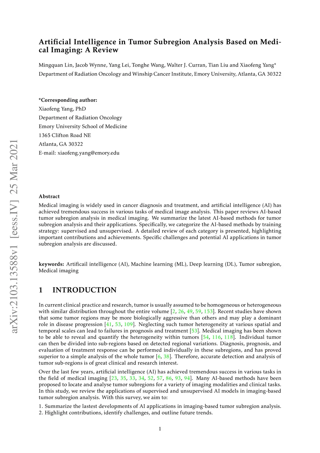 Medical imaging is widely used in cancer diagnosis and treatment, and artificial intelligence (AI) has achieved tremendous success in various tasks of medical image analysis. This paper reviews AI-based tumor subregion analysis in medical imaging. We summarize the latest AI-based methods for tumor subregion analysis and their applications. Specifically, we categorize the AI-based methods by training strategy: supervised and unsupervised. A detailed review of each category is presented, highlighting important contributions and achievements. Specific challenges and potential AI applications in tumor subregion analysis are discussed.