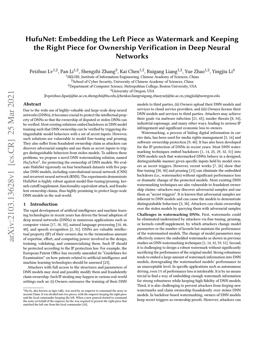 HufuNet: Embedding the Left Piece as Watermark and Keeping the Right
