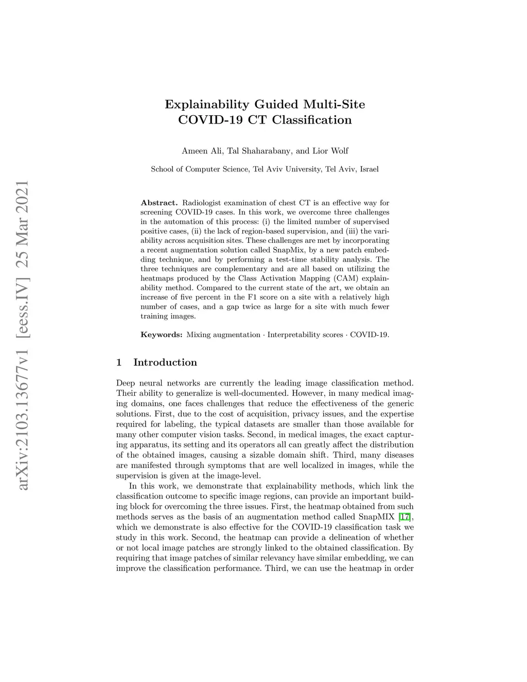 Radiologist examination of chest CT is an effective way for screening COVID-19 cases. In this work, we overcome three challenges in the automation of this process: (i) the limited number of supervised positive cases, (ii) the lack of region-based supervision, and (iii) the variability across acquisition sites. These challenges are met by incorporating a recent augmentation solution called SnapMix, by a new patch embedding technique, and by performing a test-time stability analysis. The three techniques are complementary and are all based on utilizing the heatmaps produced by the Class Activation Mapping (CAM) explainability method. Compared to the current state of the art, we obtain an increase of five percent in the F1 score on a site with a relatively high number of cases, and a gap twice as large for a site with much fewer training images.
