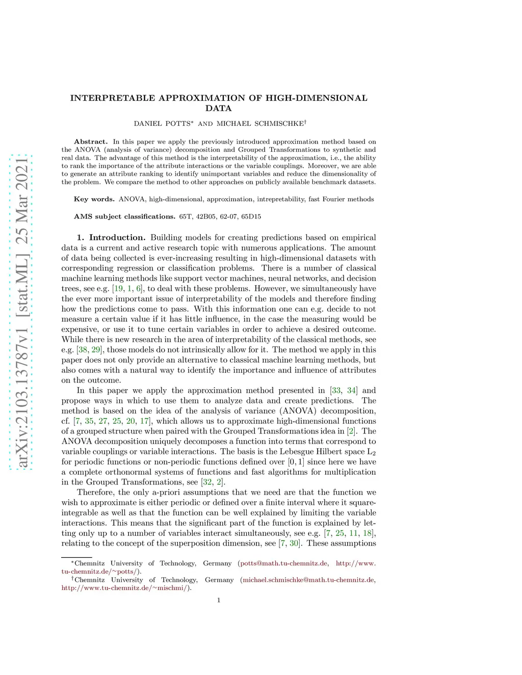 In this paper we apply the previously introduced approximation method based on the ANOVA (analysis of variance) decomposition and Grouped Transformations to synthetic and real data. The advantage of this method is the interpretability of the approximation, i.e., the ability to rank the importance of the attribute interactions or the variable couplings. Moreover, we are able to generate an attribute ranking to identify unimportant variables and reduce the dimensionality of the problem. We compare the method to other approaches on publicly available benchmark datasets.