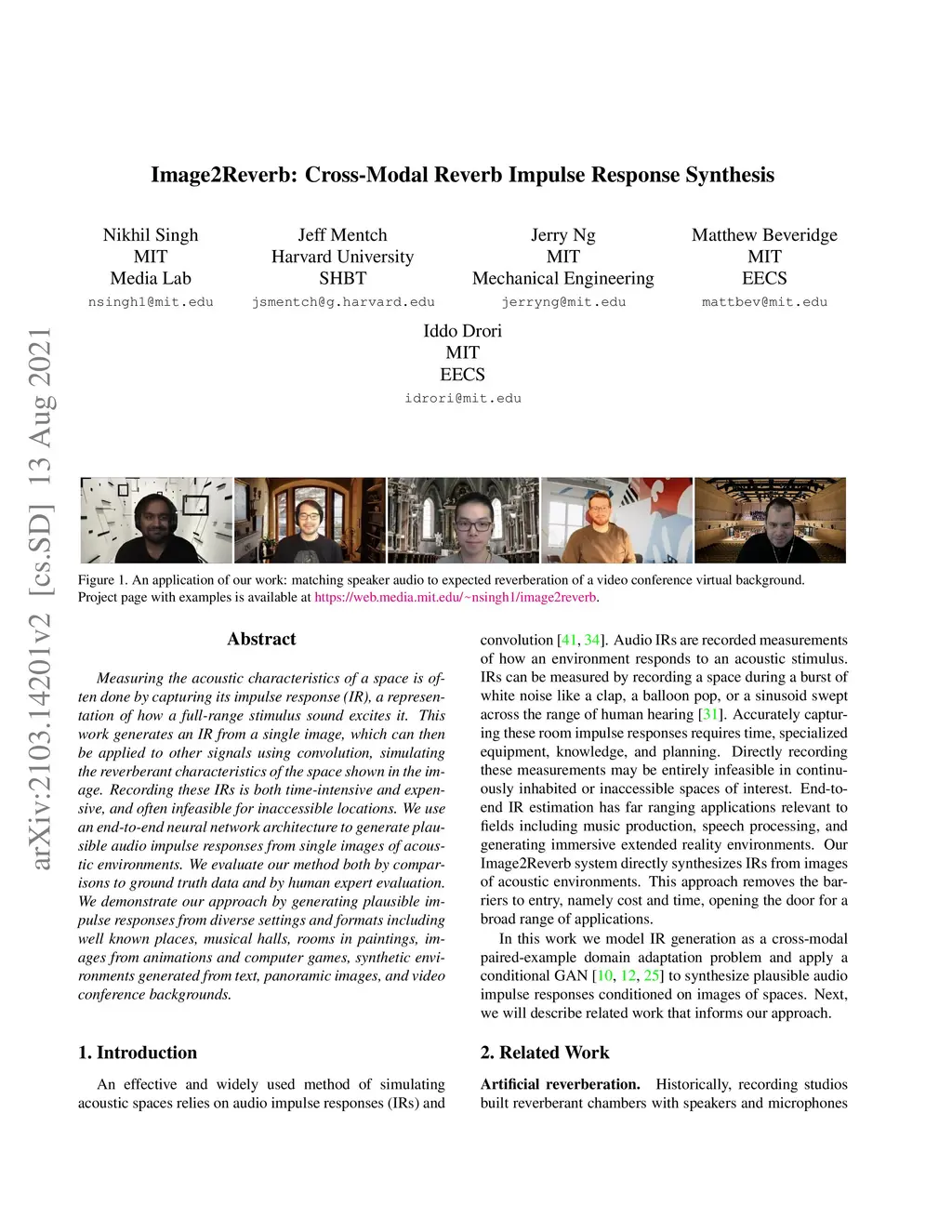 Measuring the acoustic characteristics of a space is often done by capturing its impulse response (IR), a representation of how a full-range stimulus sound excites it. This work generates an IR from a single image, which can then be applied to other signals using convolution, simulating the reverberant characteristics of the space shown in the image. Recording these IRs is both time-intensive and expensive, and often infeasible for inaccessible locations. We use an end-to-end neural network architecture to generate plausible audio impulse responses from single images of acoustic environments. We evaluate our method both by comparisons to ground truth data and by human expert evaluation. We demonstrate our approach by generating plausible impulse responses from diverse settings and formats including well known places, musical halls, rooms in paintings, images from animations and computer games, synthetic environments generated from text, panoramic images, and video conference backgrounds.