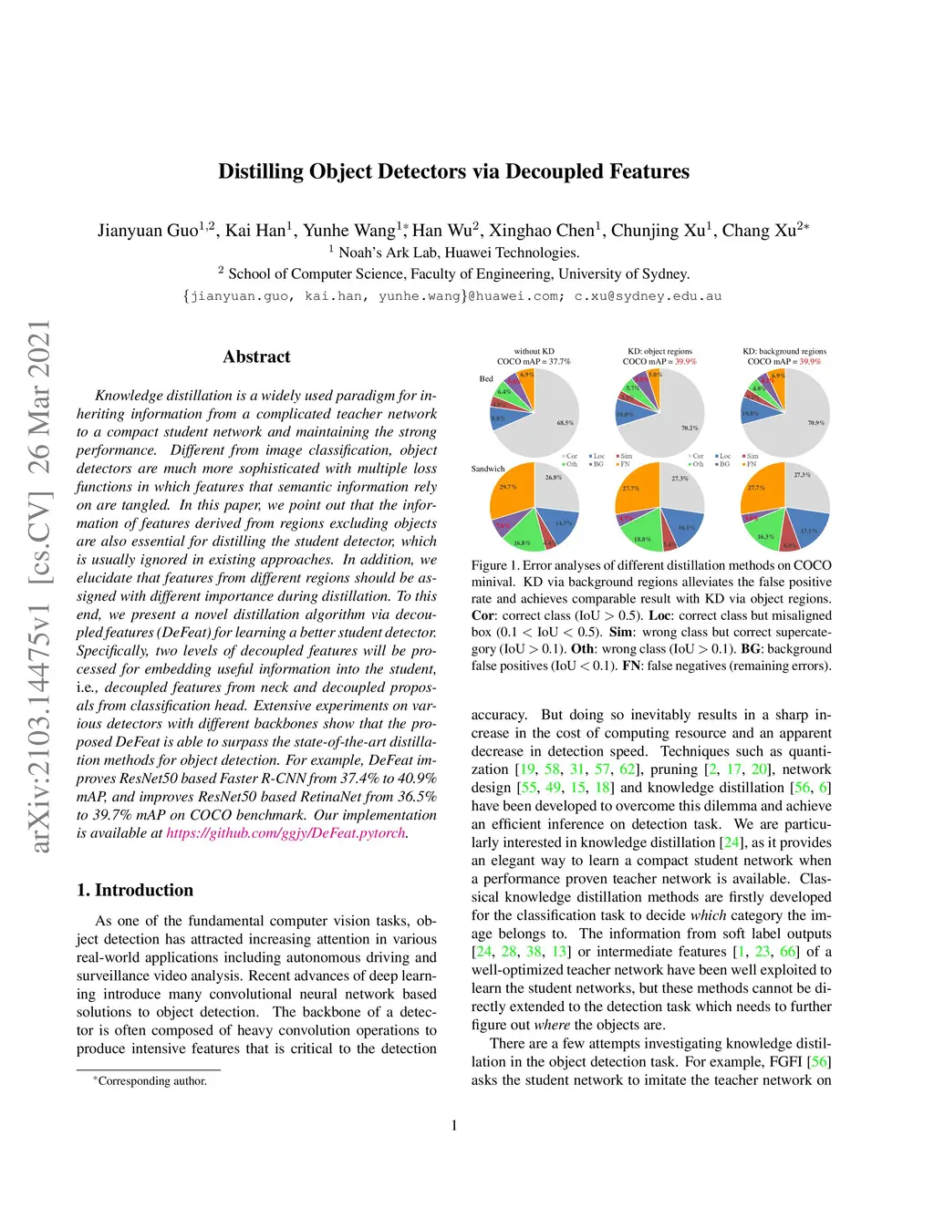 Knowledge distillation is a widely used paradigm for inheriting information from a complicated teacher network to a compact student network and maintaining the strong performance. Different from image classification, object detectors are much more sophisticated with multiple loss functions in which features that semantic information rely on are tangled. In this paper, we point out that the information of features derived from regions excluding objects are also essential for distilling the student detector, which is usually ignored in existing approaches. In addition, we elucidate that features from different regions should be assigned with different importance during distillation. To this end, we present a novel distillation algorithm via decoupled features (DeFeat) for learning a better student detector. Specifically, two levels of decoupled features will be processed for embedding useful information into the student, i.e., decoupled features from neck and decoupled proposals from classification head. Extensive experiments on various detectors with different backbones show that the proposed DeFeat is able to surpass the state-of-the-art distillation methods for object detection. For example, DeFeat improves ResNet50 based Faster R-CNN from 37.4% to 40.9% mAP, and improves ResNet50 based RetinaNet from 36.5% to 39.7% mAP on COCO benchmark. Our implementation is available at https://github.com/ggjy/DeFeat.pytorch.