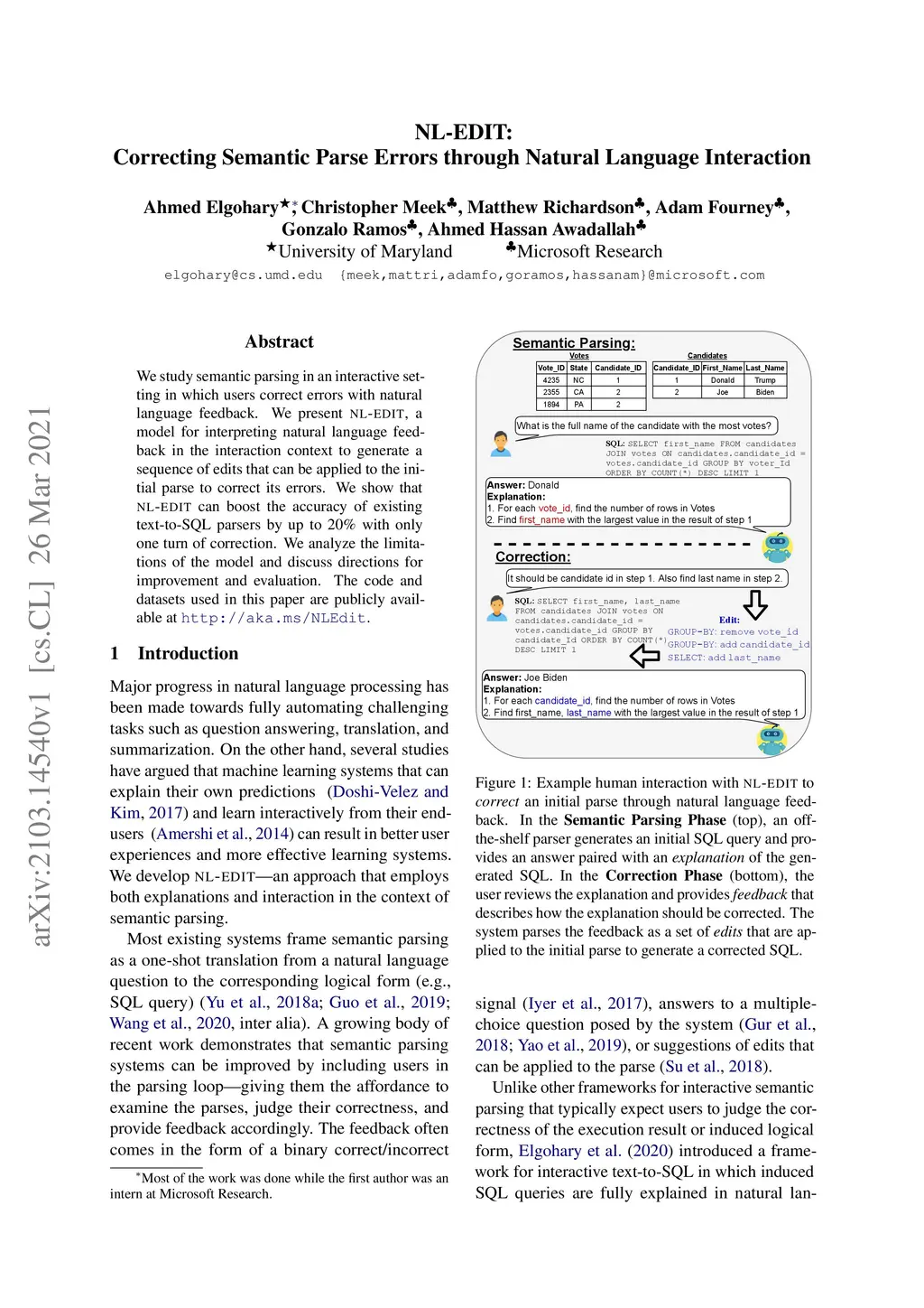 We study semantic parsing in an interactive setting in which users correct errors with natural language feedback. We present NL-EDIT, a model for interpreting natural language feedback in the interaction context to generate a sequence of edits that can be applied to the initial parse to correct its errors. We show that NL-EDIT can boost the accuracy of existing text-to-SQL parsers by up to 20% with only one turn of correction. We analyze the limitations of the model and discuss directions for improvement and evaluation. The code and datasets used in this paper are publicly available at http://aka.ms/NLEdit.