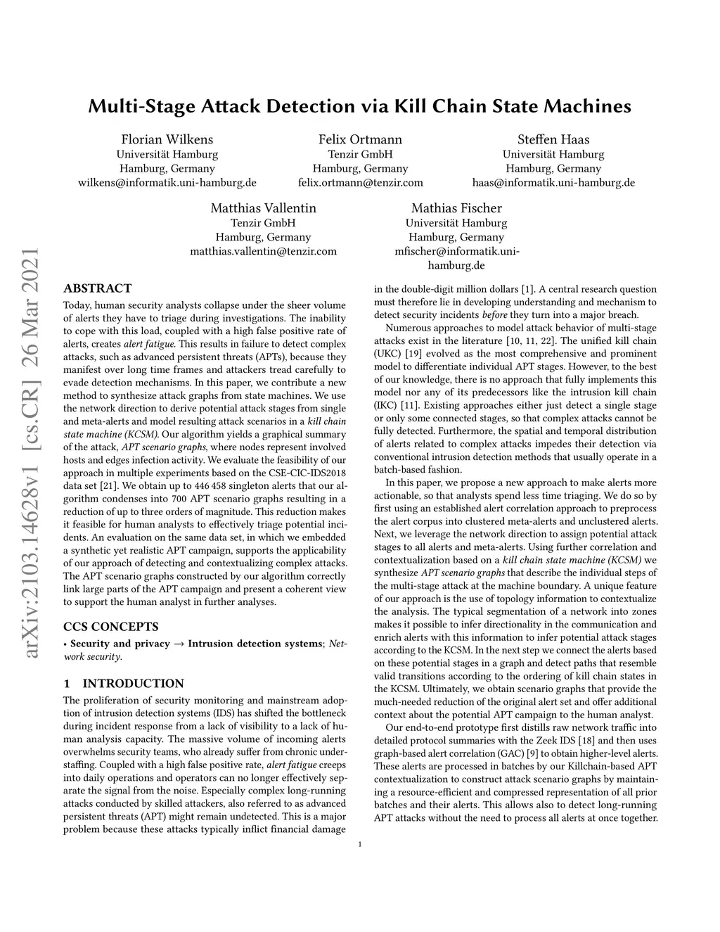 Today, human security analysts collapse under the sheer volume of alerts they have to triage during investigations. The inability to cope with this load, coupled with a high false positive rate of alerts, creates alert fatigue. This results in failure to detect complex attacks, such as advanced persistent threats (APTs), because they manifest over long time frames and attackers tread carefully to evade detection mechanisms. In this paper, we contribute a new method to synthesize attack graphs from state machines. We use the network direction to derive potential attack stages from single and meta-alerts and model resulting attack scenarios in a kill chain state machine (KCSM). Our algorithm yields a graphical summary of the attack, APT scenario graphs, where nodes represent involved hosts and edges infection activity. We evaluate the feasibility of our approach in multiple experiments based on the CSE-CIC-IDS2018 data set. We obtain up to 446 458 singleton alerts that our algorithm condenses into 700 APT scenario graphs resulting in a reduction of up to three orders of magnitude. This reduction makes it feasible for human analysts to effectively triage potential incidents. An evaluation on the same data set, in which we embedded a synthetic yet realistic APT campaign, supports the applicability of our approach of detecting and contextualizing complex attacks. The APT scenario graphs constructed by our algorithm correctly link large parts of the APT campaign and present a coherent view to support the human analyst in further analyses.