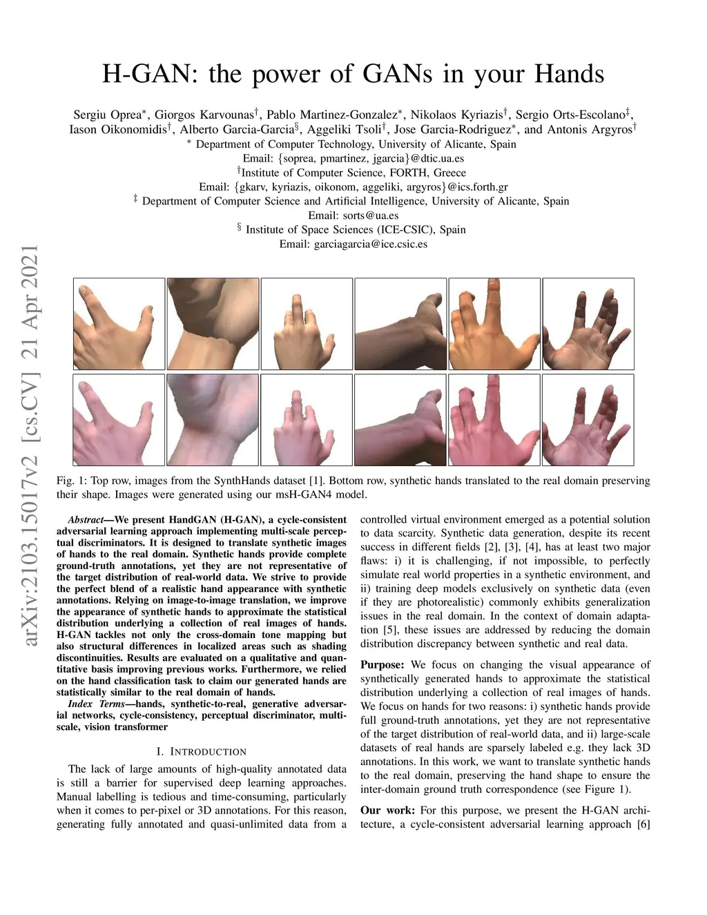 We present HandGAN (H-GAN), a cycle-consistent adversarial learning approach implementing multi-scale perceptual discriminators. It is designed to translate synthetic images of hands to the real domain. Synthetic hands provide complete ground-truth annotations, yet they are not representative of the target distribution of real-world data. We strive to provide the perfect blend of a realistic hand appearance with synthetic annotations. Relying on image-to-image translation, we improve the appearance of synthetic hands to approximate the statistical distribution underlying a collection of real images of hands. H-GAN tackles not only the cross-domain tone mapping but also structural differences in localized areas such as shading discontinuities. Results are evaluated on a qualitative and quantitative basis improving previous works. Furthermore, we relied on the hand classification task to claim our generated hands are statistically similar to the real domain of hands.