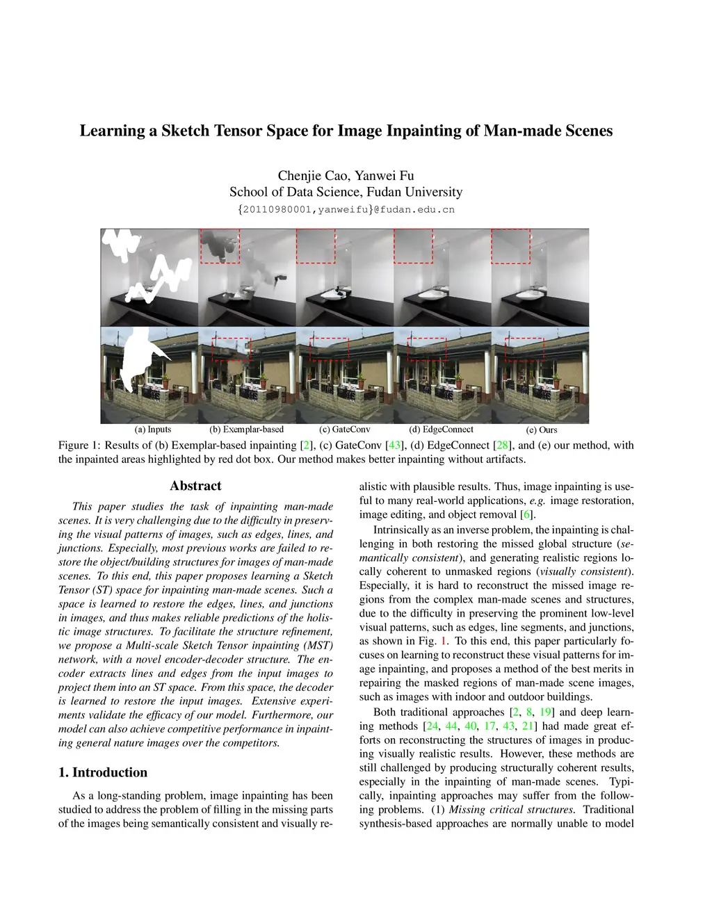 Learning a Sketch Tensor Space for Image Inpainting of Man-made Scenes